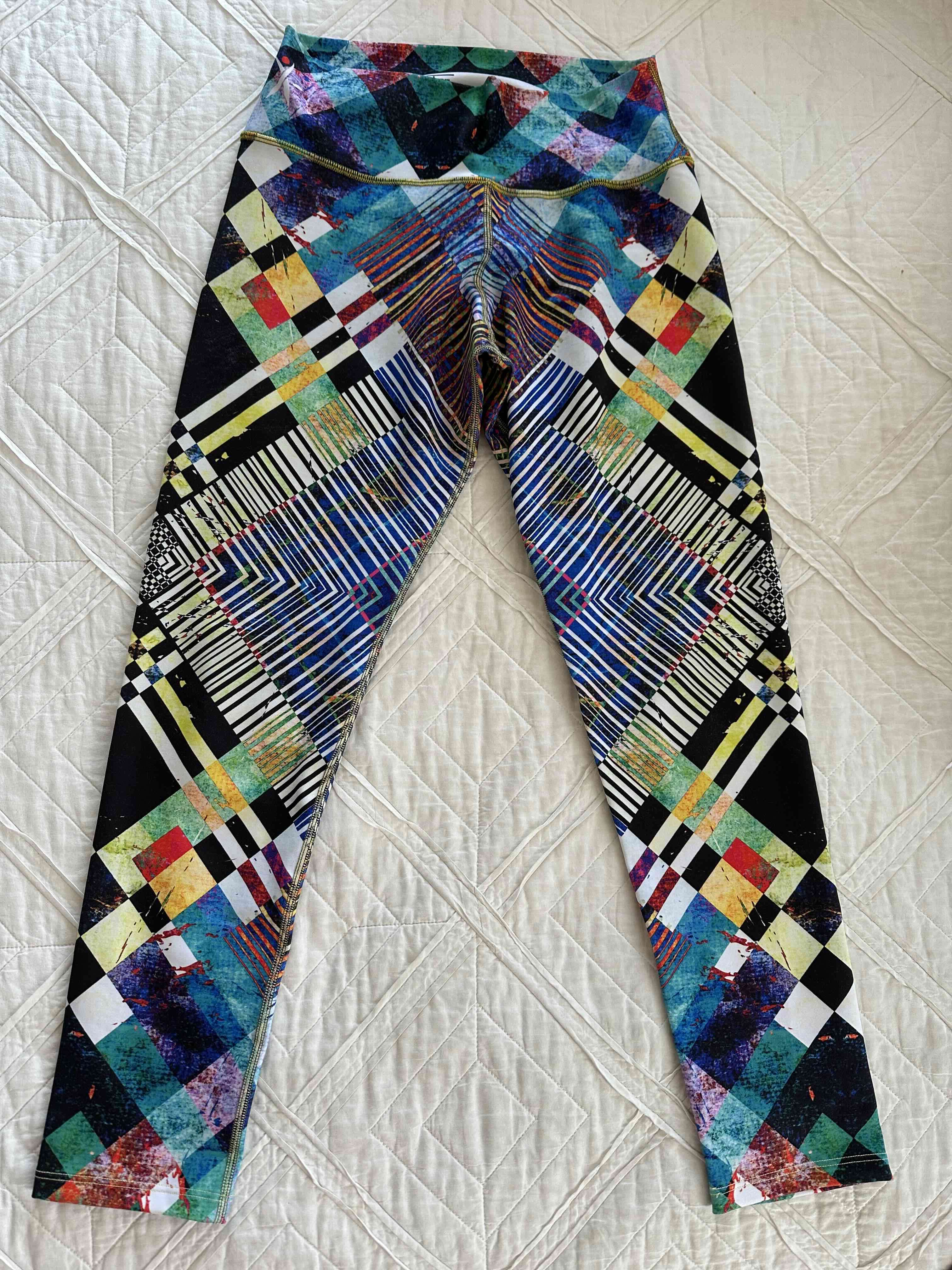 Leggings con diseño geométrico colorido, ideal para deporte. Buen estado, ligeros signos de uso.