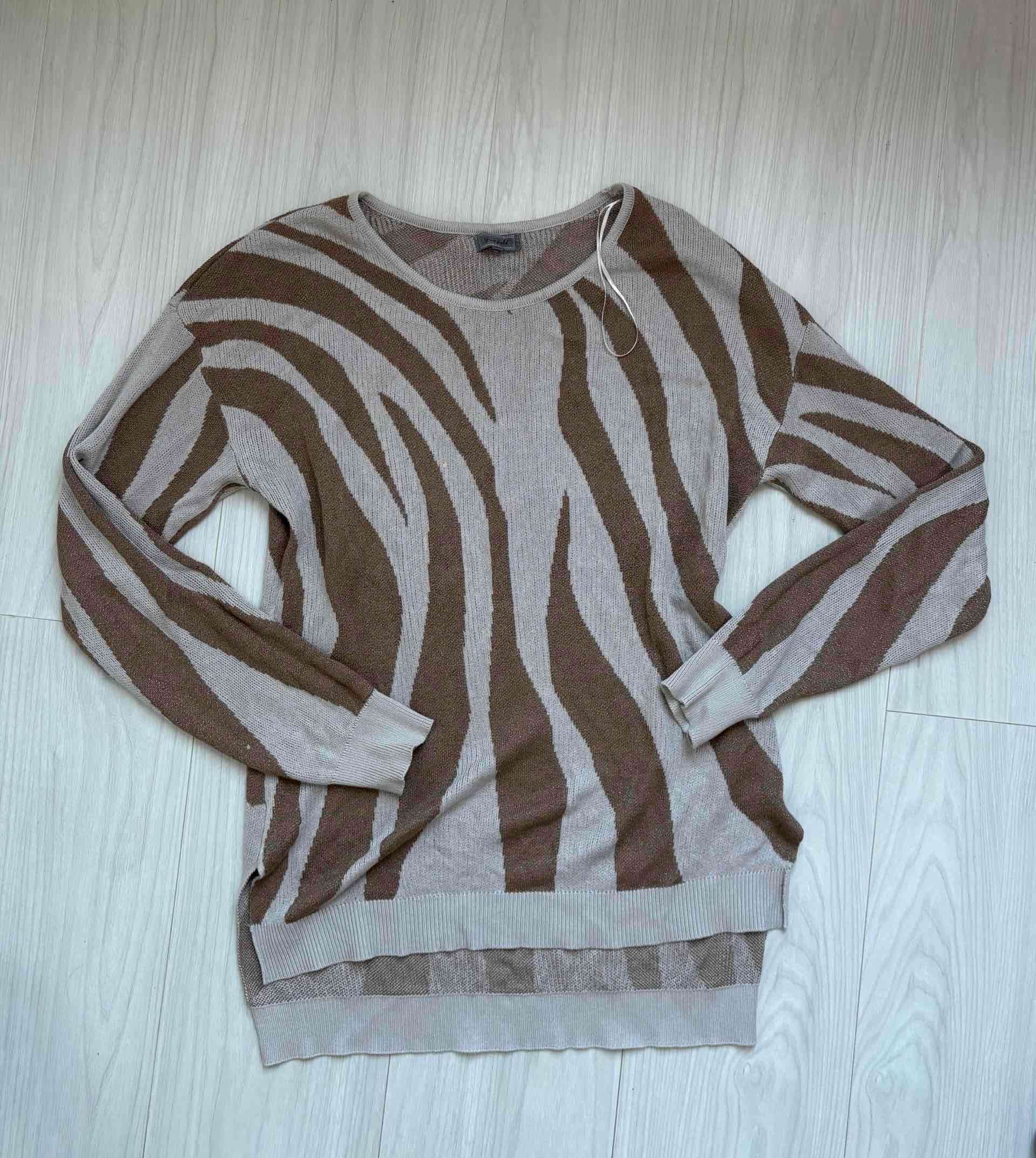 Suéter con diseño de rayas tipo cebra en tonos marrón y beige. Ideal para un look casual. Buen estado general.