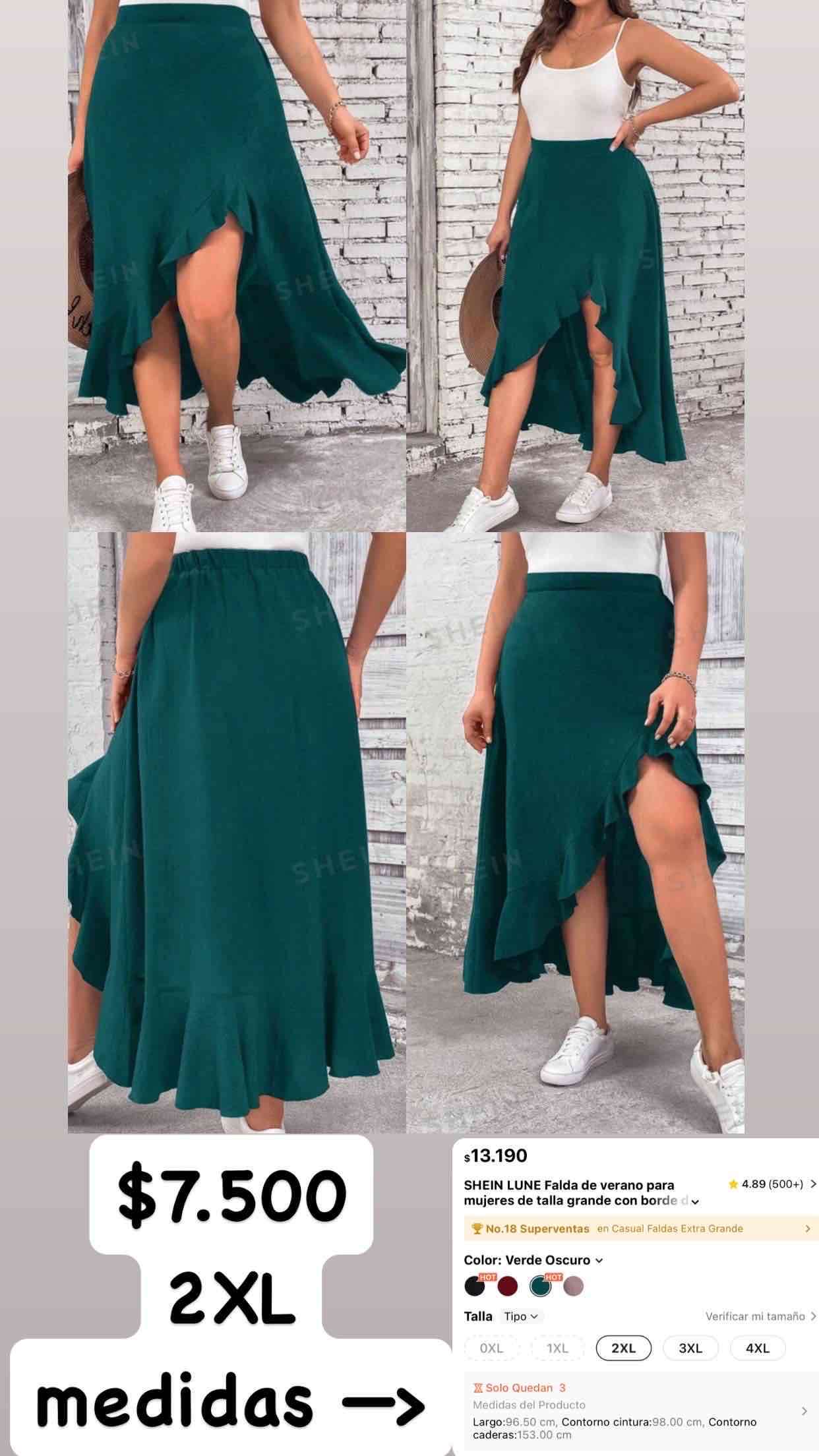 Falda de verano en color verde oscuro, con diseño de vuelo y abertura frontal. Perfecta para un look casual y cómodo.
