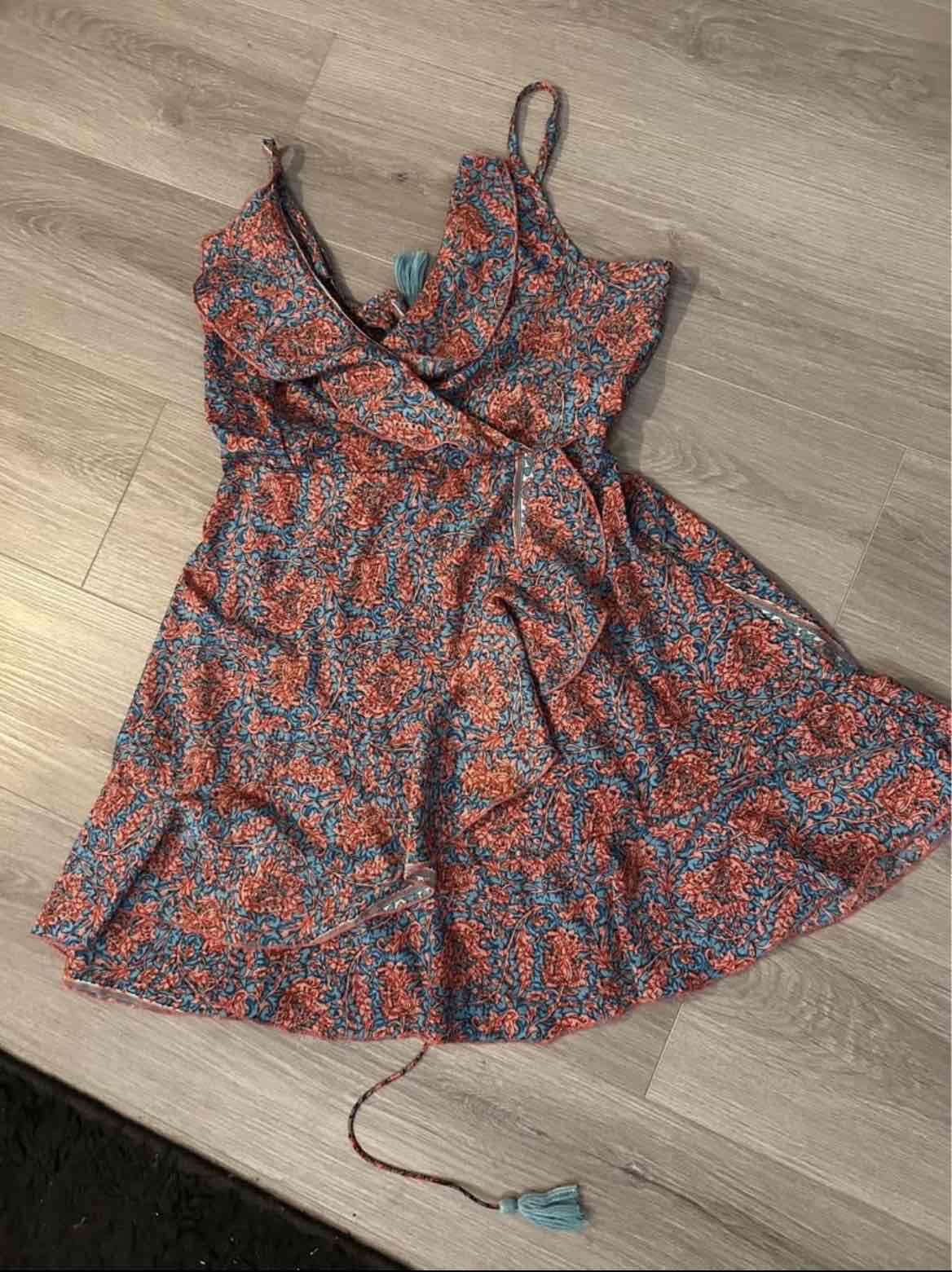 Vestido con diseño floral colorido, ideal para el verano. Se ve en buen estado y listo para usar, tire descocido una tirita atrás para abrochar , pero los demás si