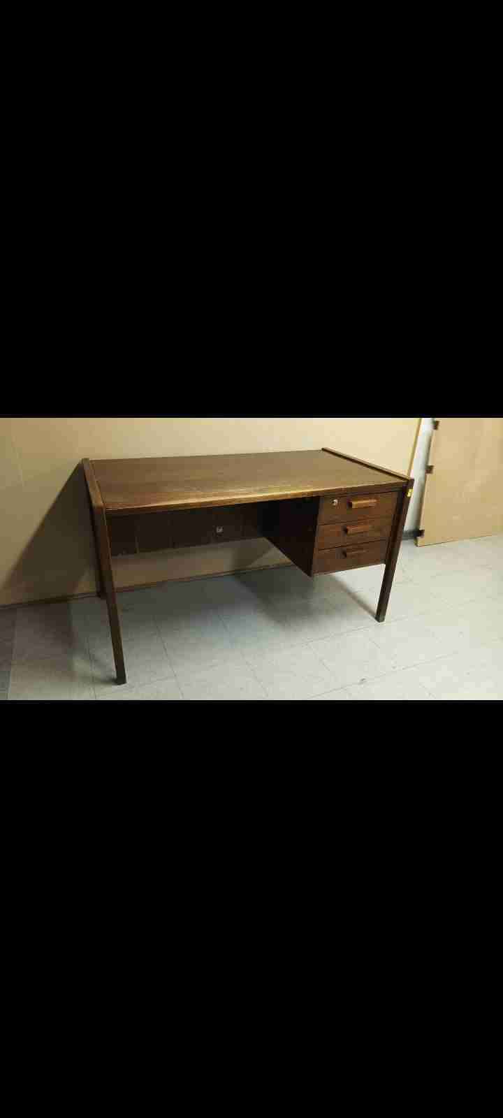 Escritorio de madera con cajones, ideal para oficina o estudio. En buen estado general, algunos signos de uso.