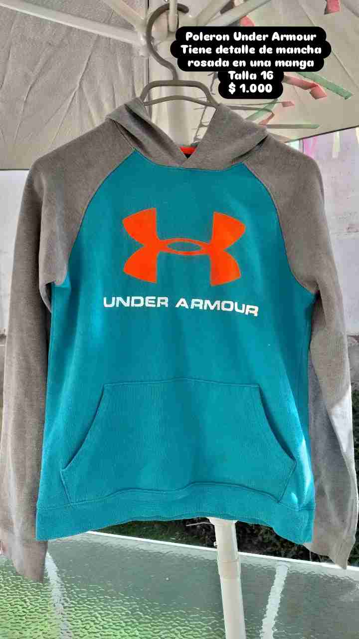 Polerón cómodo con capucha y logo destacable talla 16. Detalle de mancha rosada en una manga. Perfecto para días fríos.