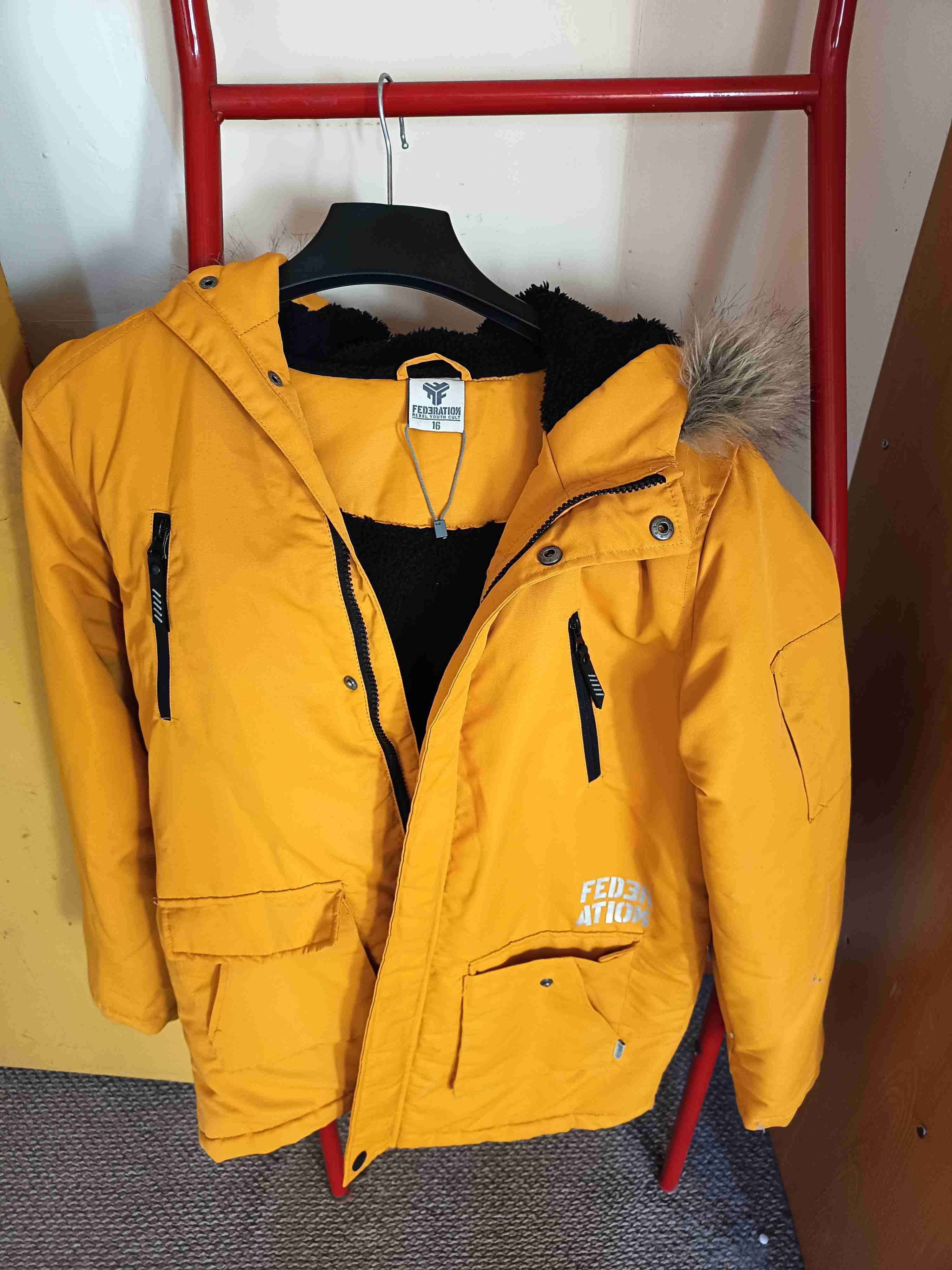 Chaqueta de invierno amarilla con capucha de piel sintética ideal para tiempos fríos. Excelente estado, muy abrigadora y cómoda.conversable