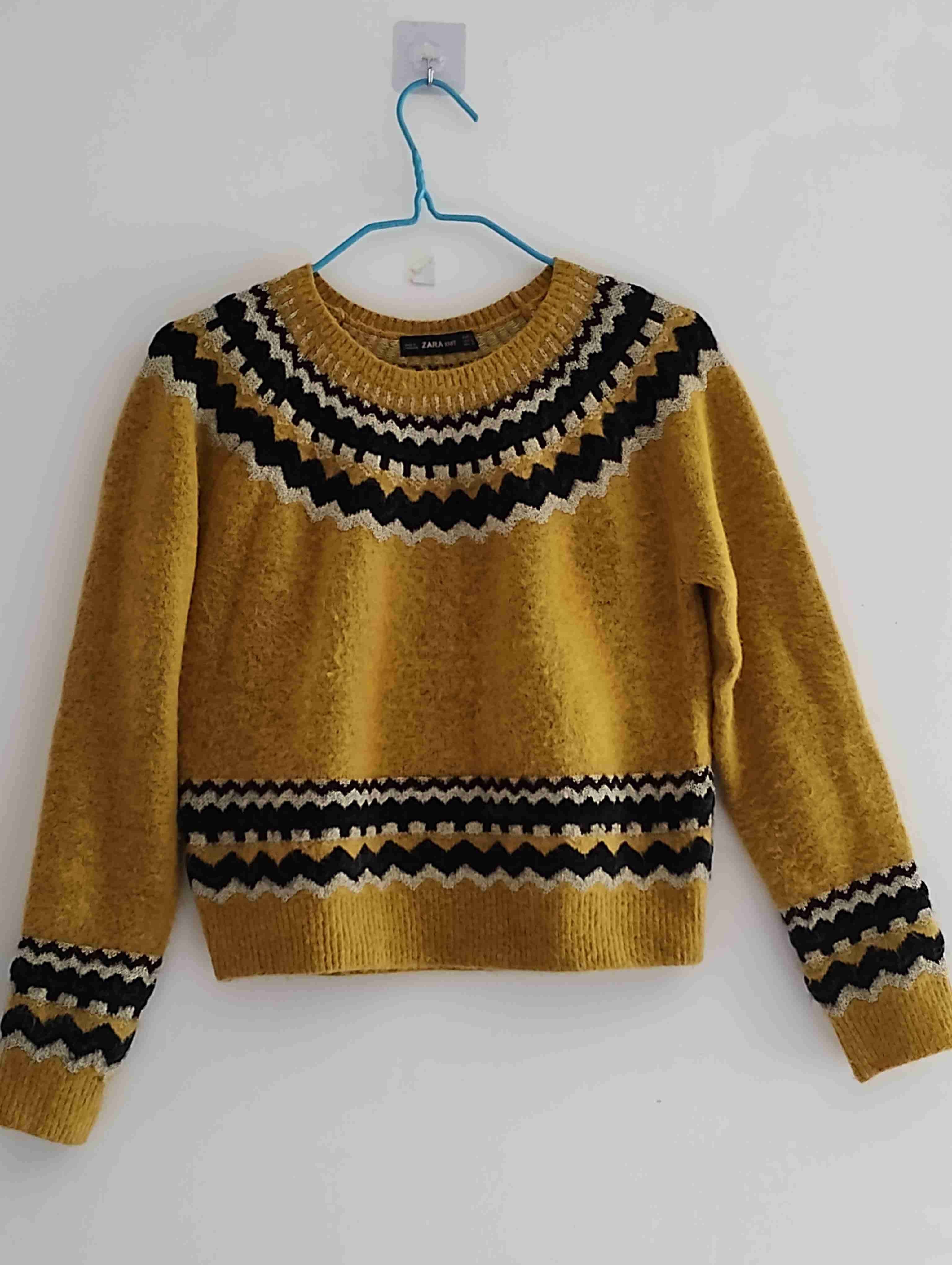Suéter de color mostaza con un atractivo diseño étnico. Ideal para el invierno, en buen estado.