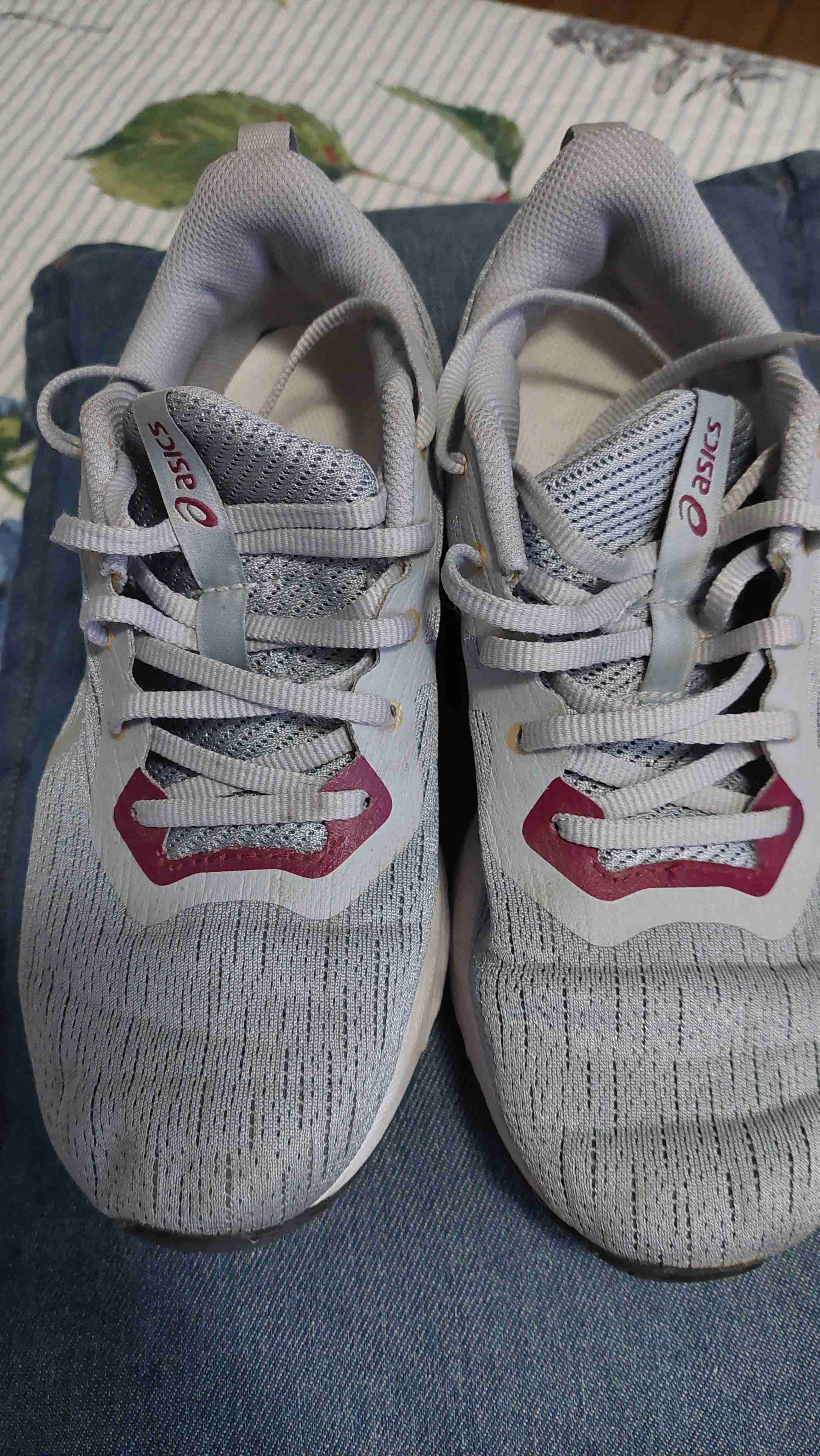 Zapatillas Asics en buen estado, color gris con detalles rosados. Perfectas para actividades deportivas.