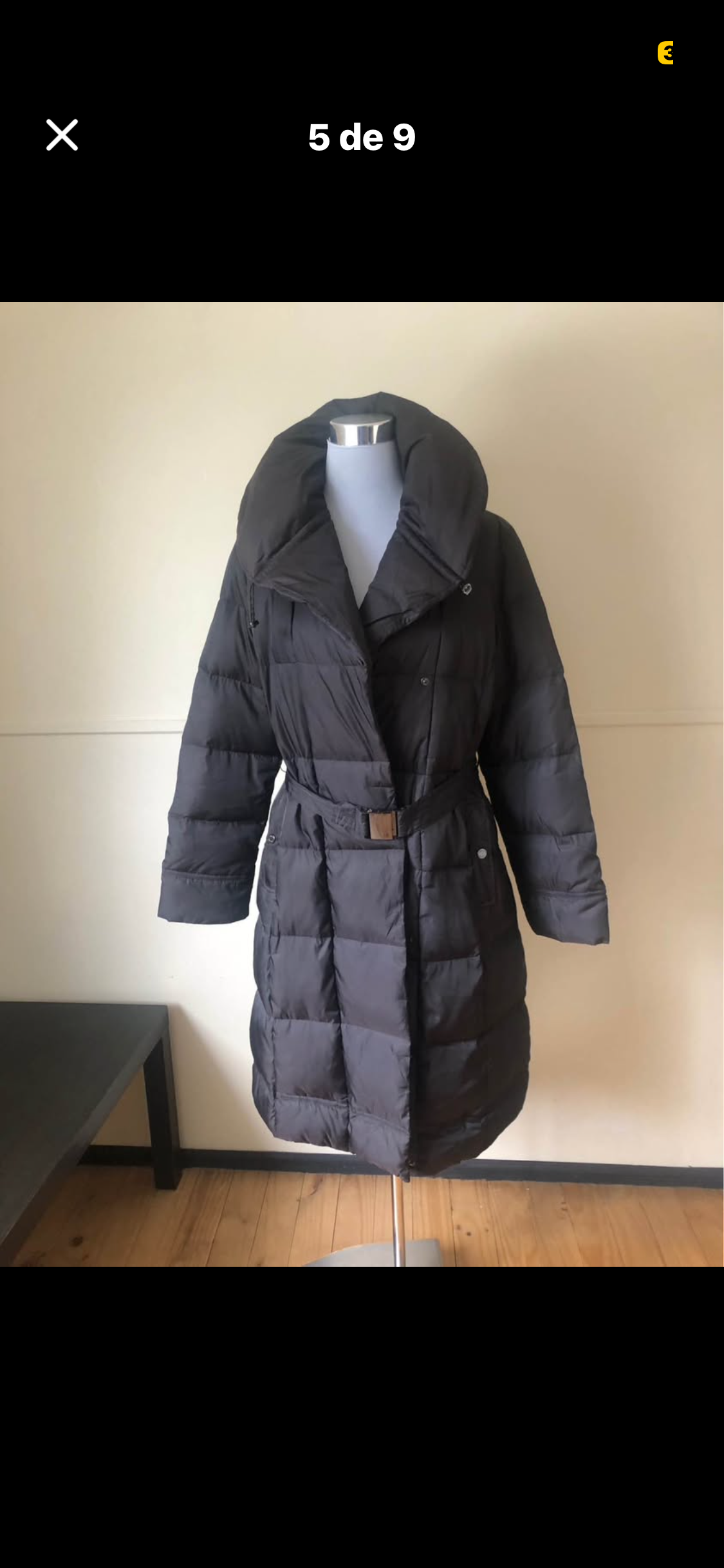 Elegante abrigo negro acolchado con cinturón, ideal para días fríos. En buen estado, perfecto para un look formal o casual.color café de plumas
