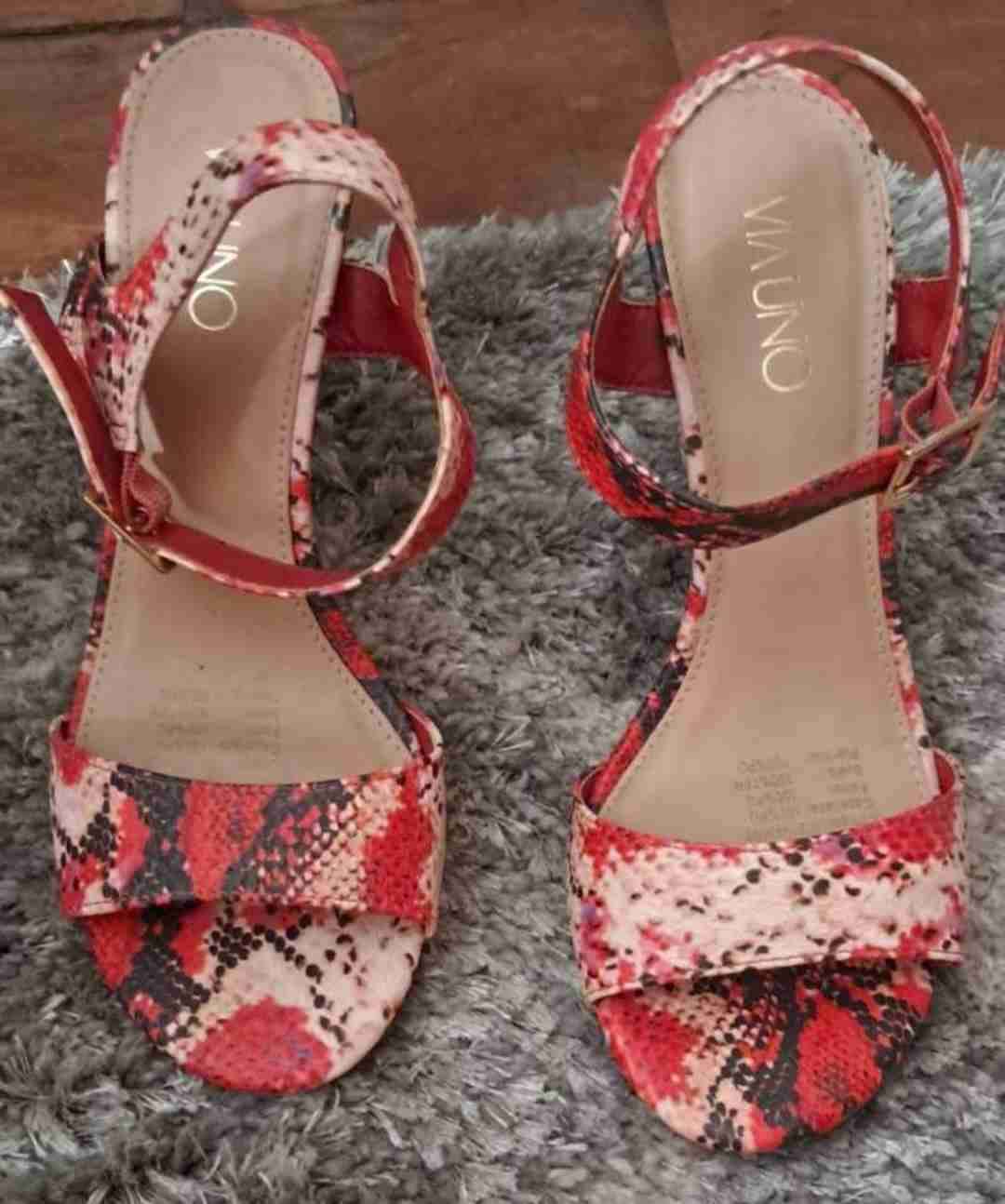 Sandalias con tacón, estampado de serpiente en tonos rojos y cremas. Perfectas para una salida casual.
