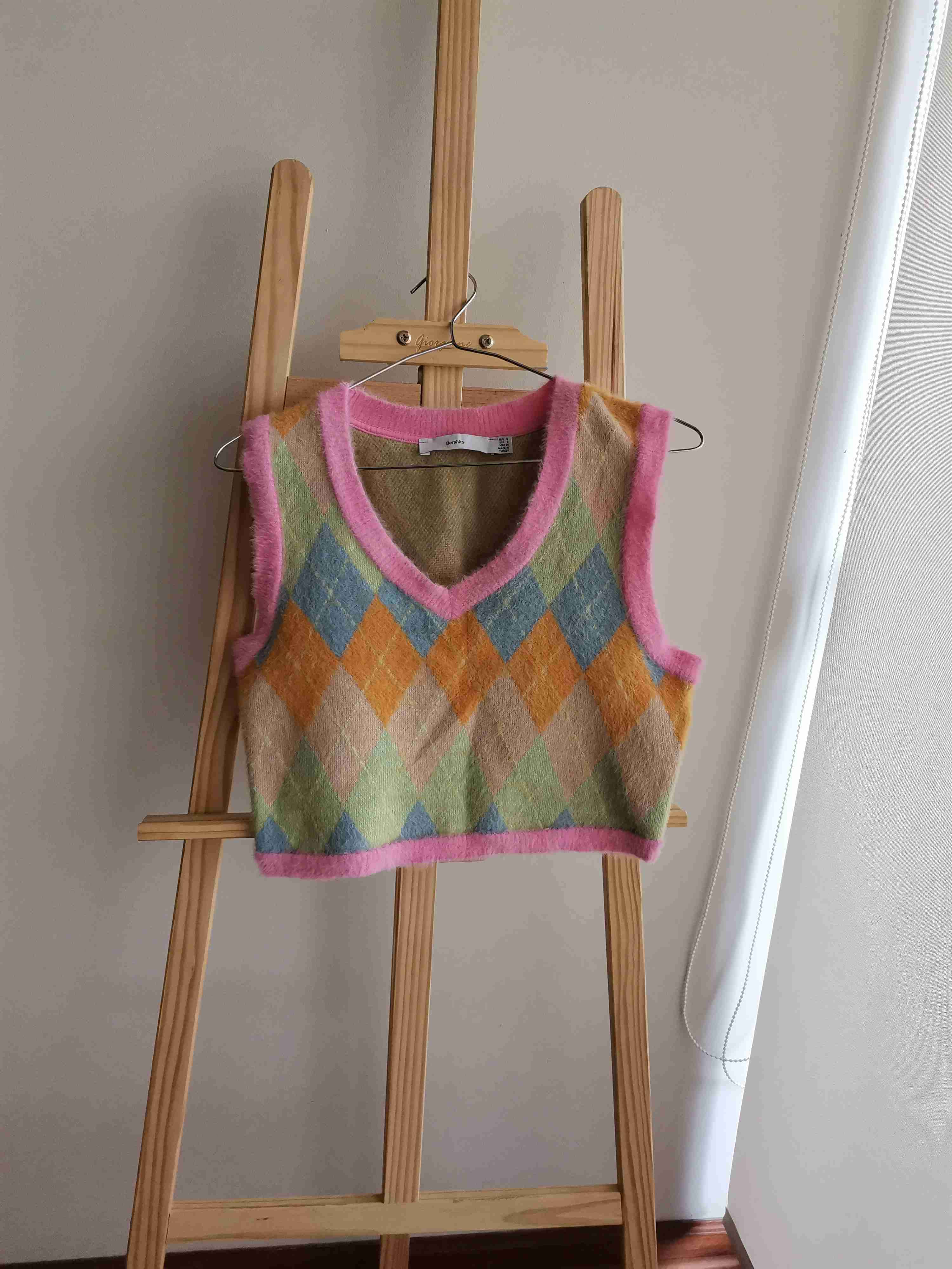 Chaleco sin mangas de estilo alegre y colorido, perfecto para primavera. En buen estado, ideal para un look casual y divertido.