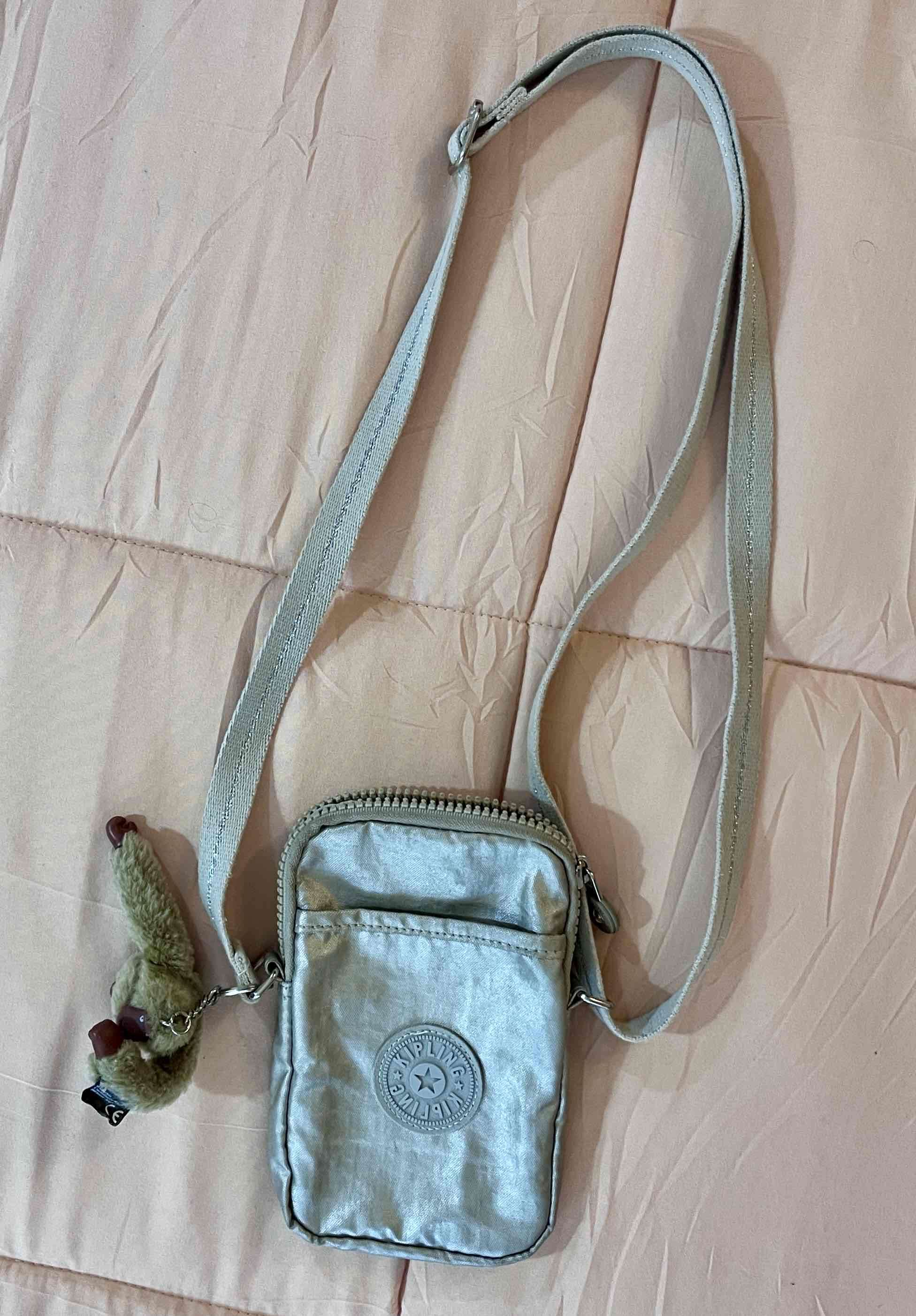 Bolso KIPLING compacto gris, ideal para salidas casuales. Incluye colgante decorativo. Se encuentra en buen estado.
