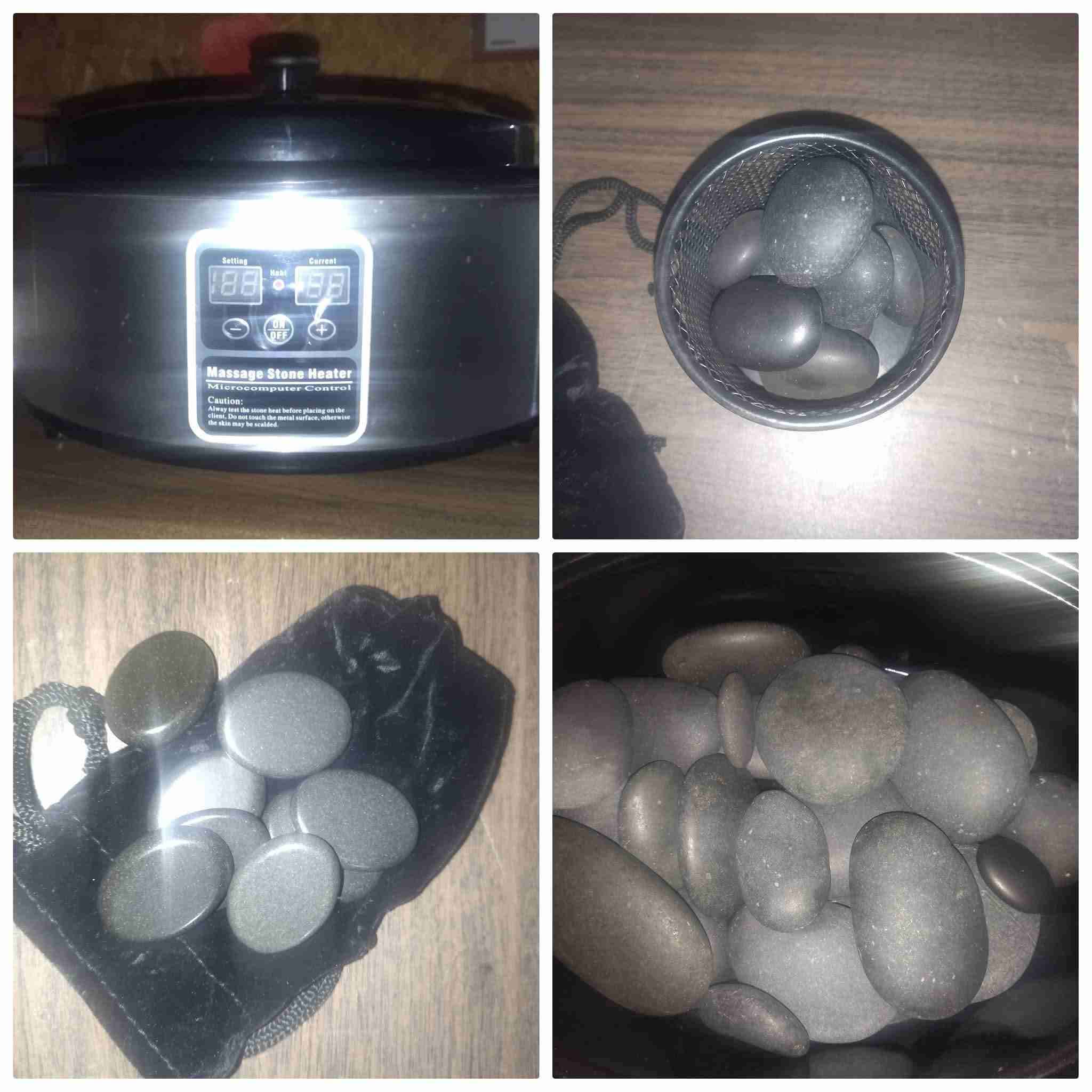 Set de piedras de masaje con calentador eléctrico. Ideal para relajación y terapias. Incluye bolsa de almacenamiento.