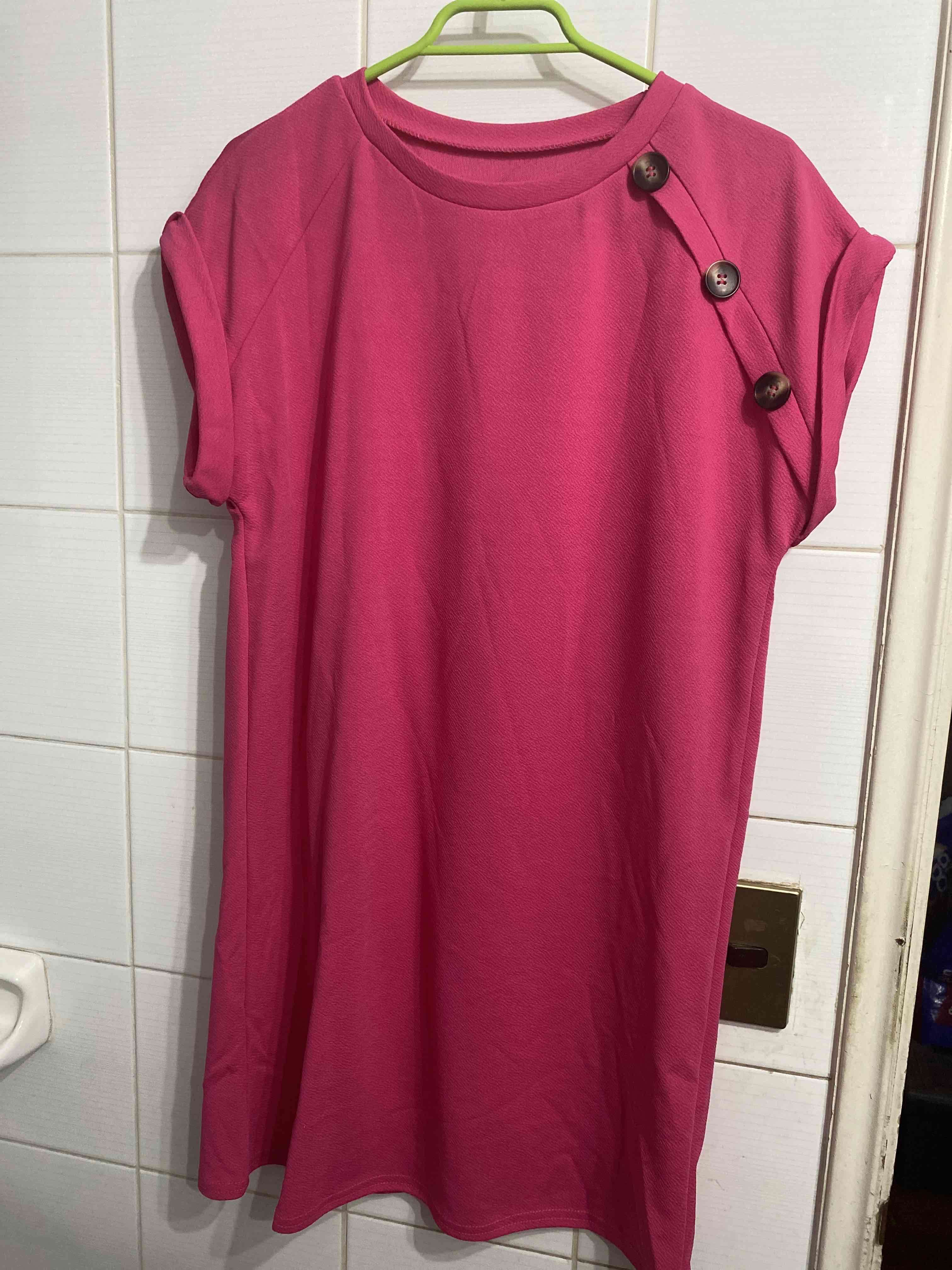 Vestido fucsia casual con detalle de botones en el hombro. Ideal para el día a día, en buen estado.
