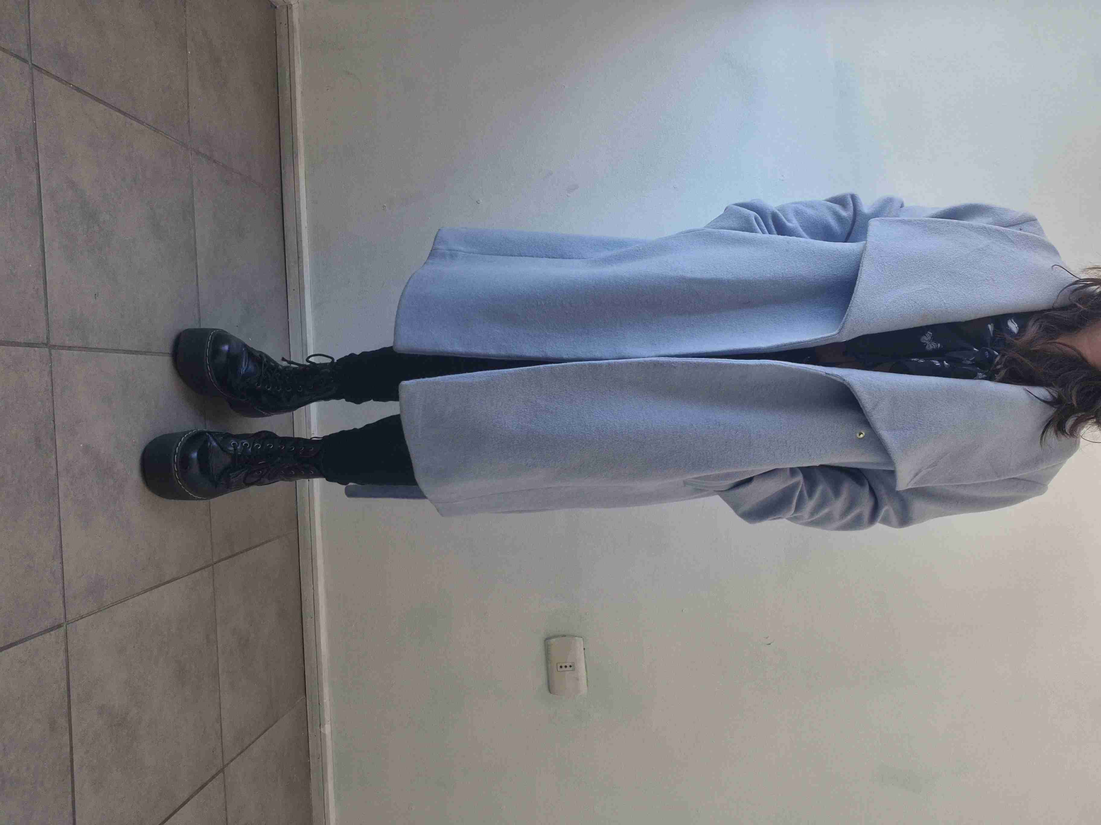 Elegante abrigo largo en color celeste, ideal para días fríos. En buen estado