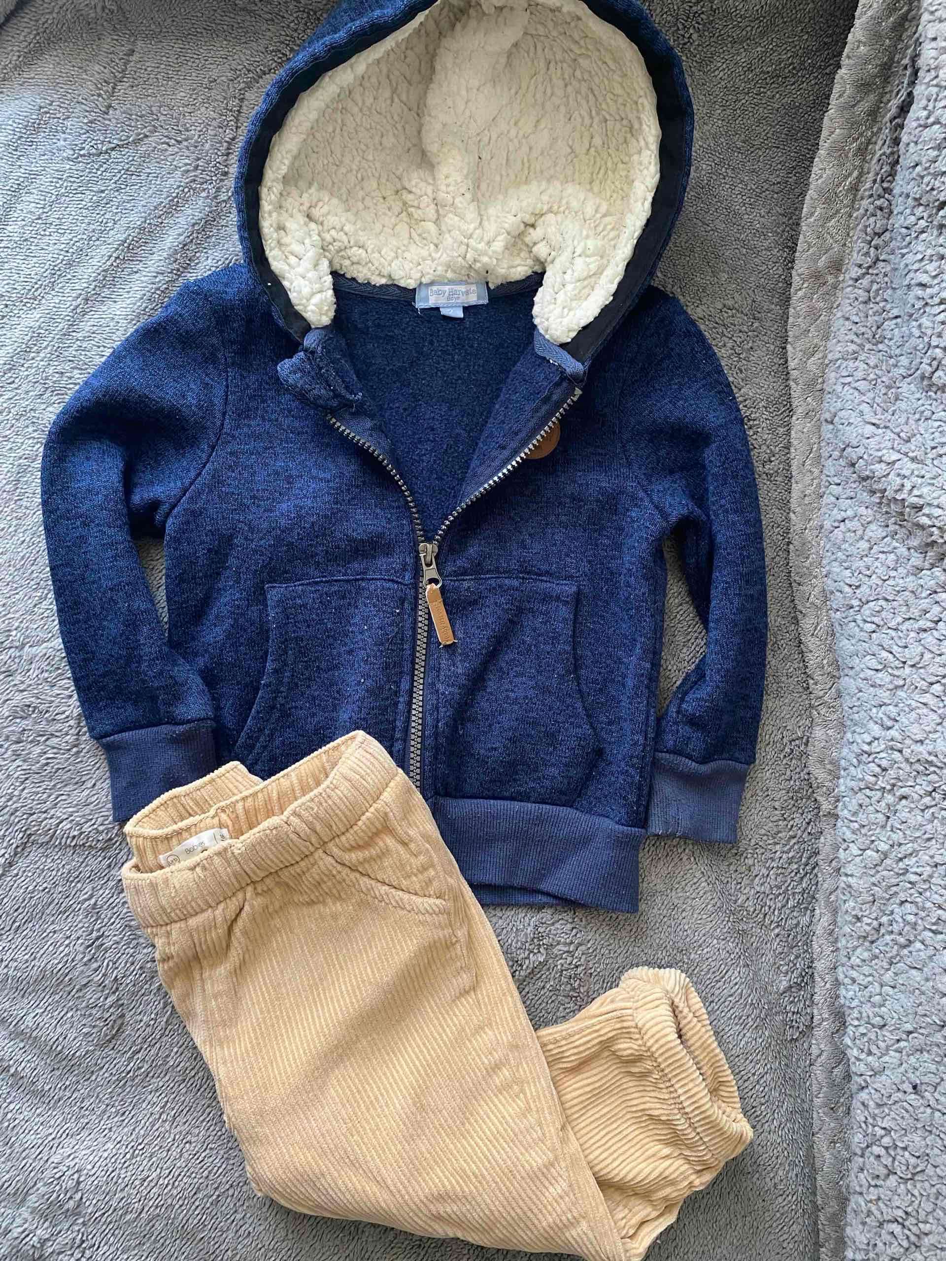 Conjunto para niño de polar azul oscuro con capucha y pantalones beige. Ideal para días fríos. Buen estado general, con uso leve. Cada conjunto $5.000