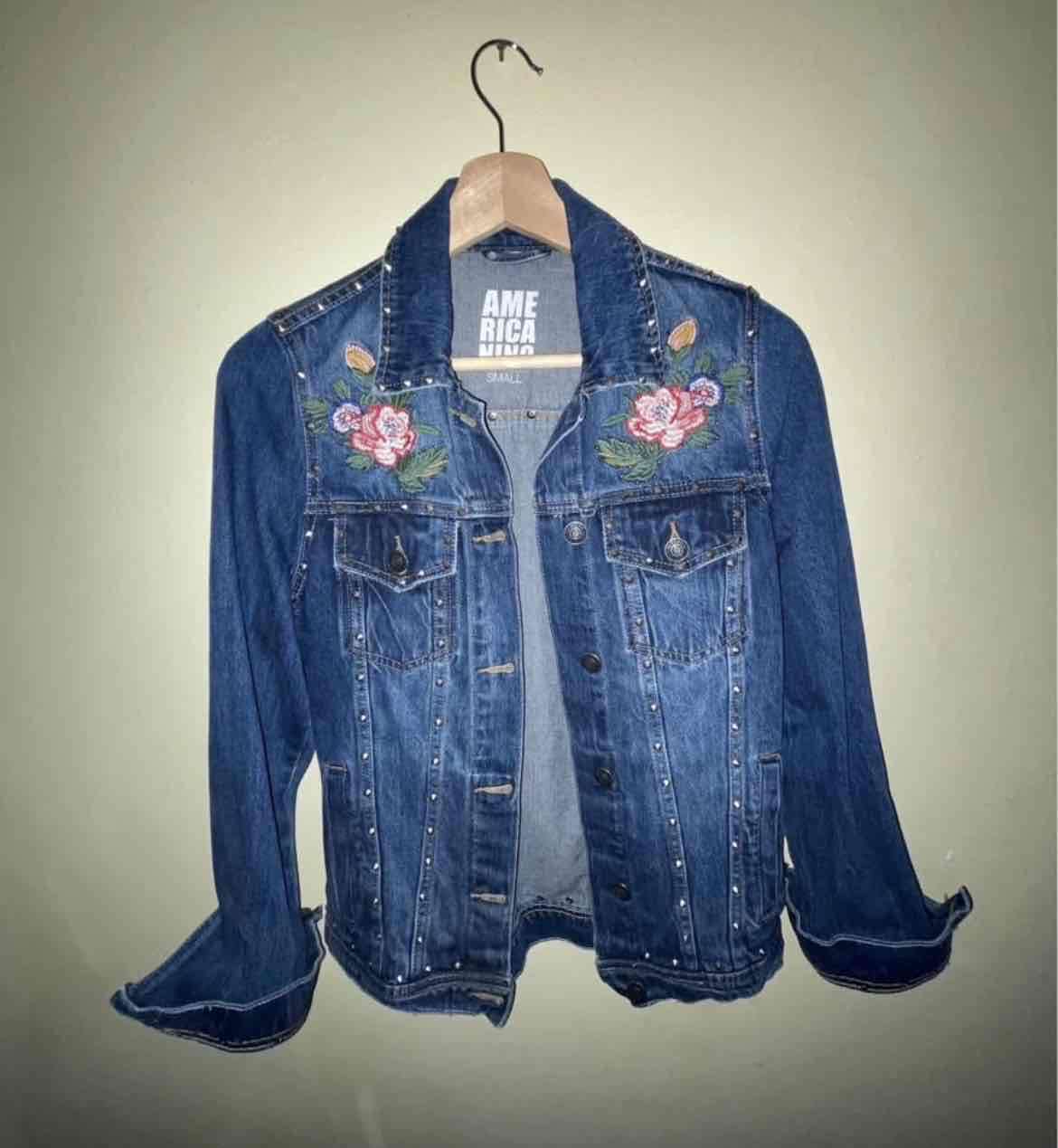 Chaqueta denim con bordado floral y tachuelas. En buen estado, perfecta para el otoño.