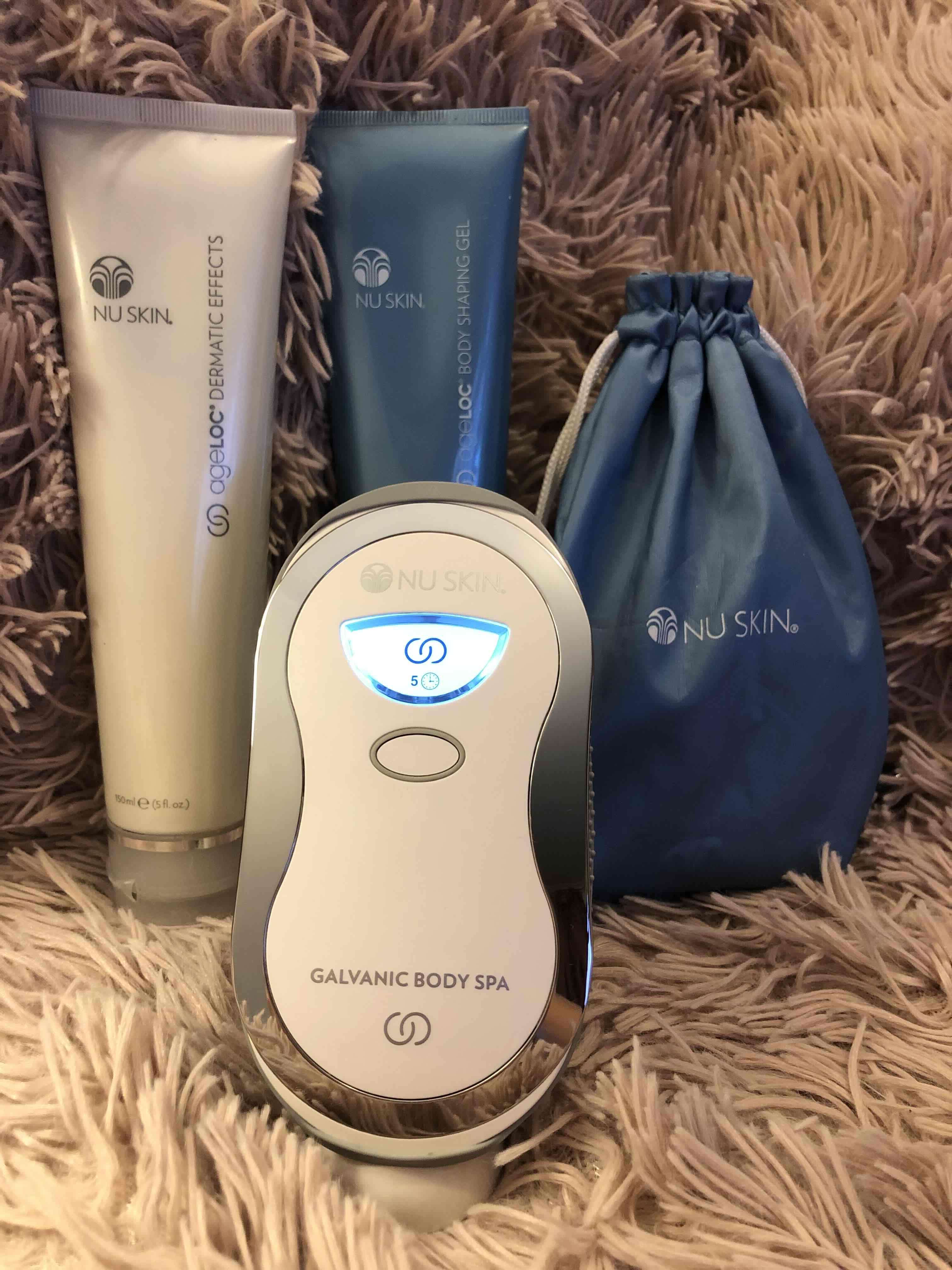 Kit de spa corporal Nu Skin con dispositivo galvánico y geles. Ideal para cuidado personal y relajación en casa.