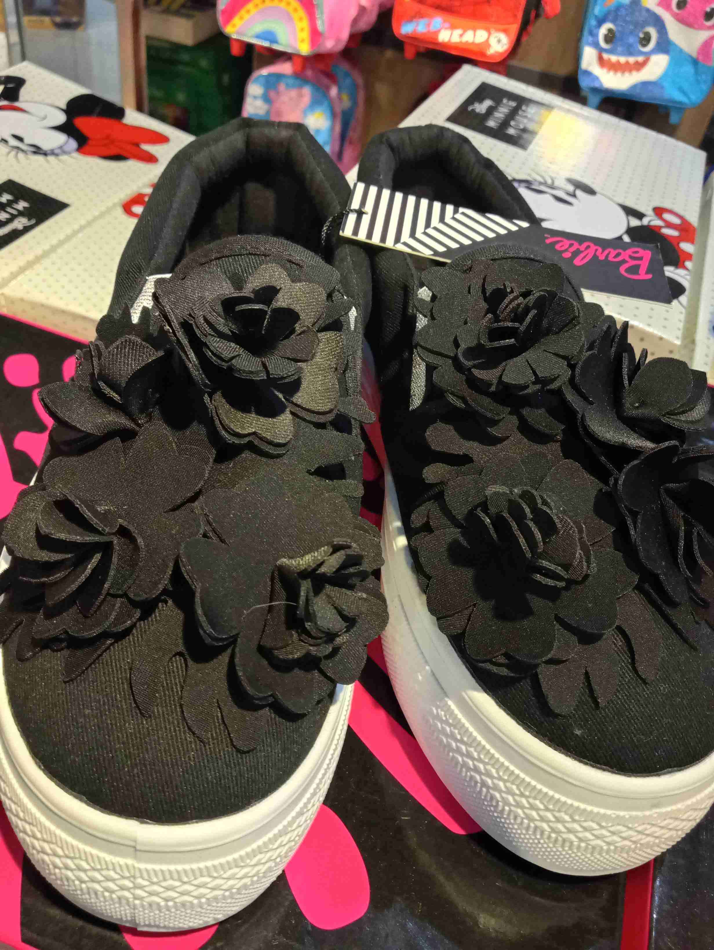 Zapatillas negras decoradas con flores en la parte superior. En buen estado, ideales para un look casual y moderno.
