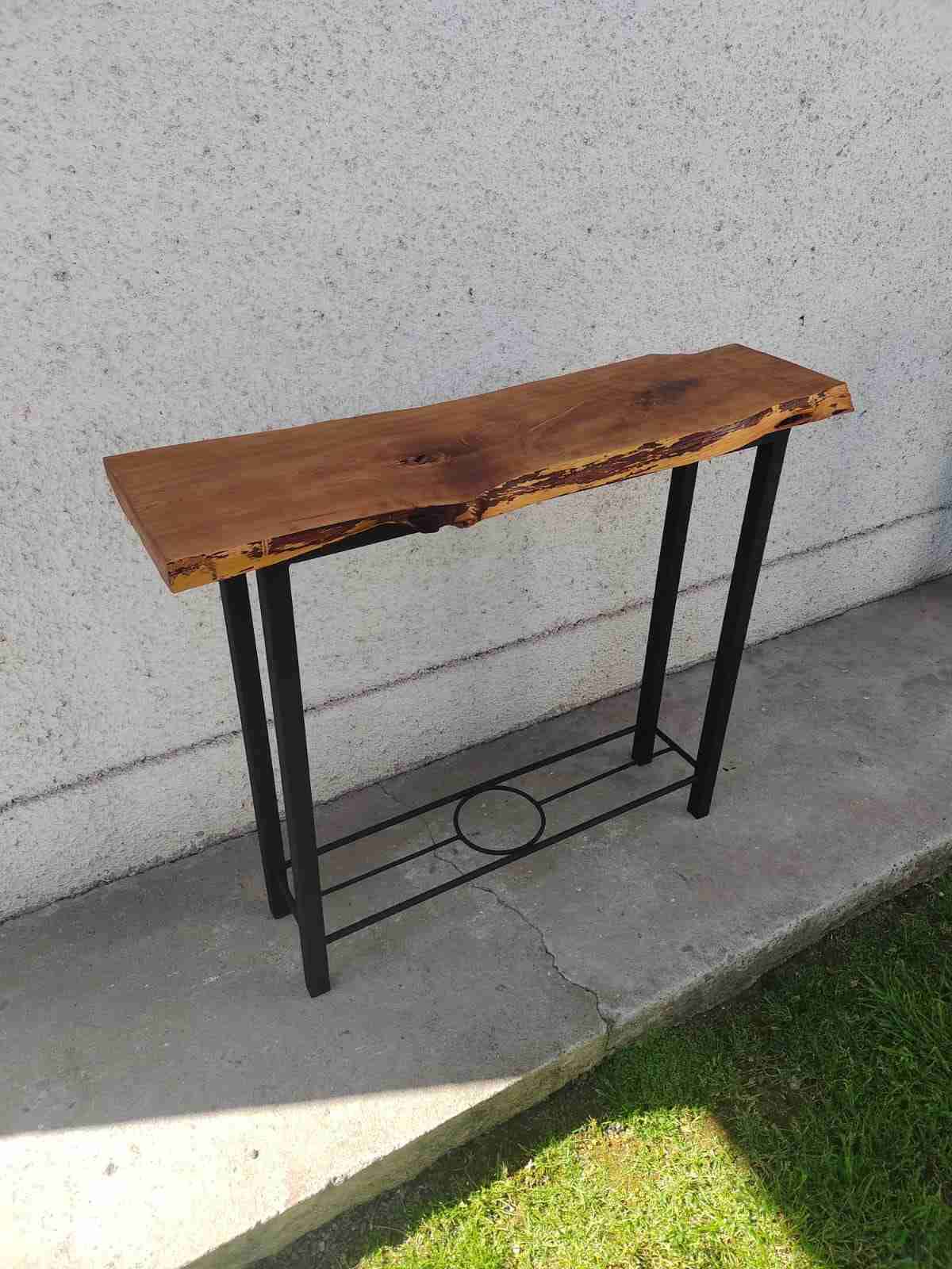 Mesa de arrimo con cubierta de madera rústica y patas de metal. Ideal para decorar entradas o pasillos. En buen estado. Hecho a mano.