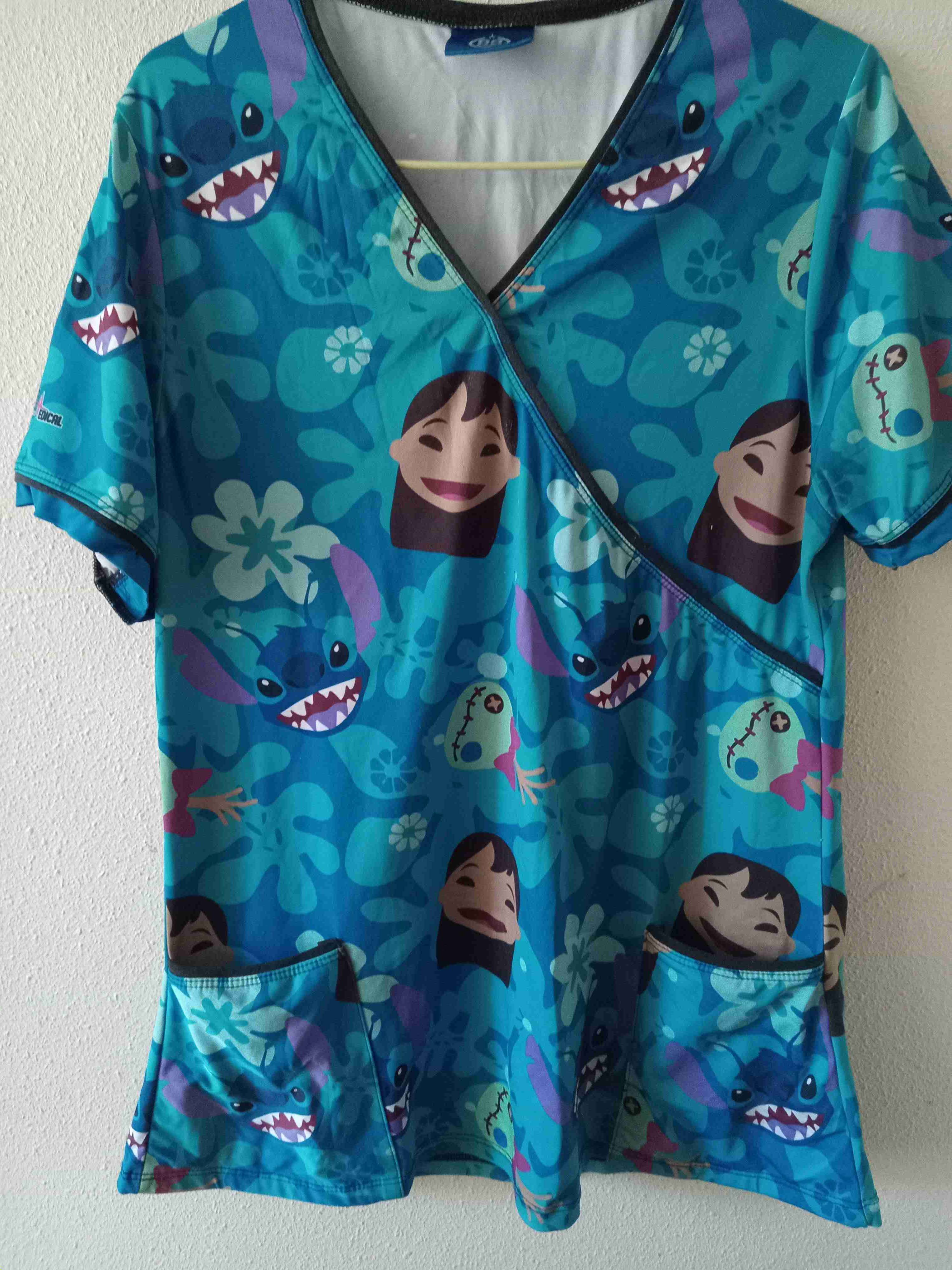 Blusa médica con divertido estampado de Lilo y Stitch, ideal para profesionales de la salud. En buen estado con colores vivos.