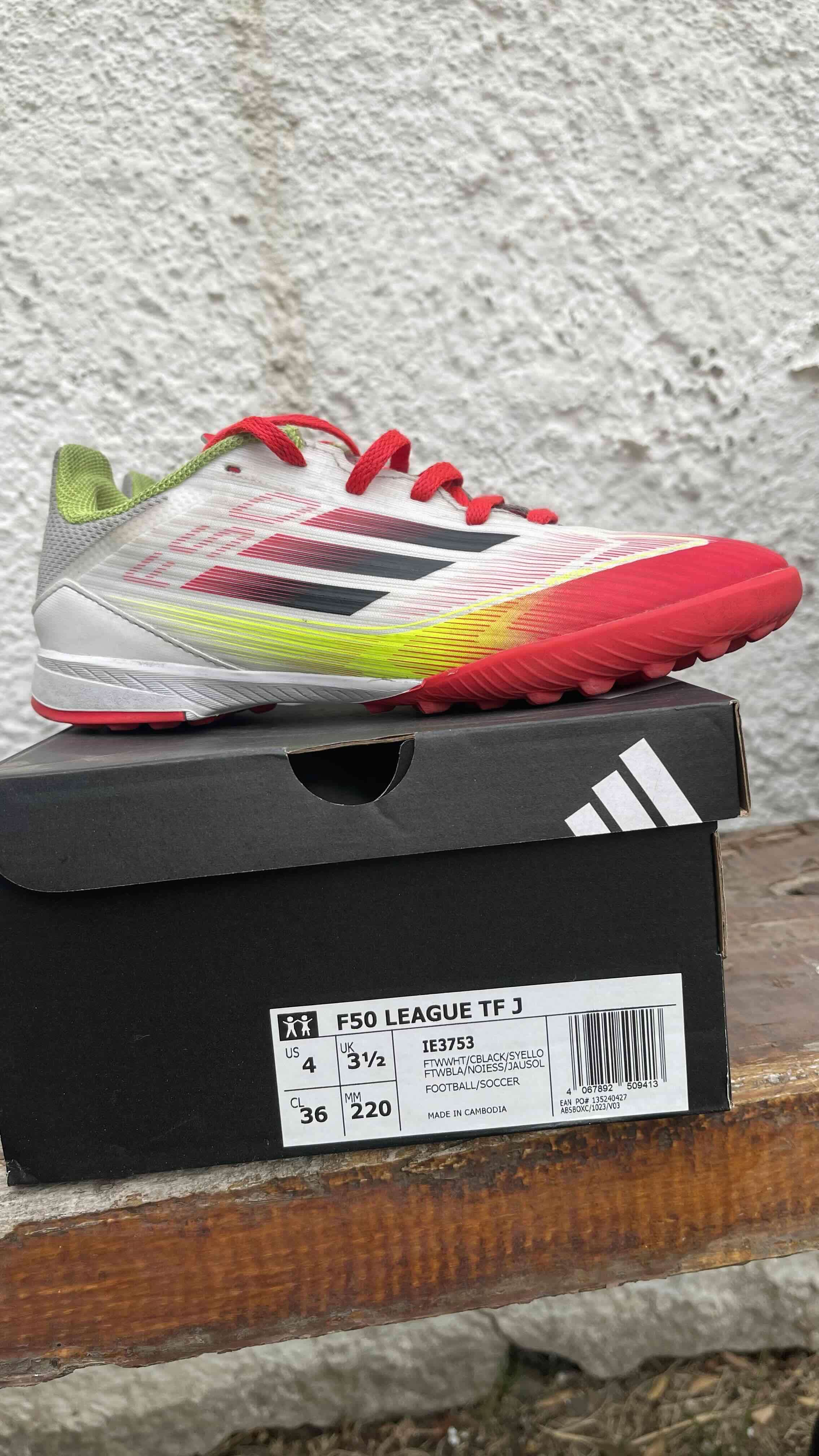 Zapatos de fútbol para niños, modelo F50 en color blanco y rojo, ideales para pasto sintético. Buen estado. N°36- 22 cms