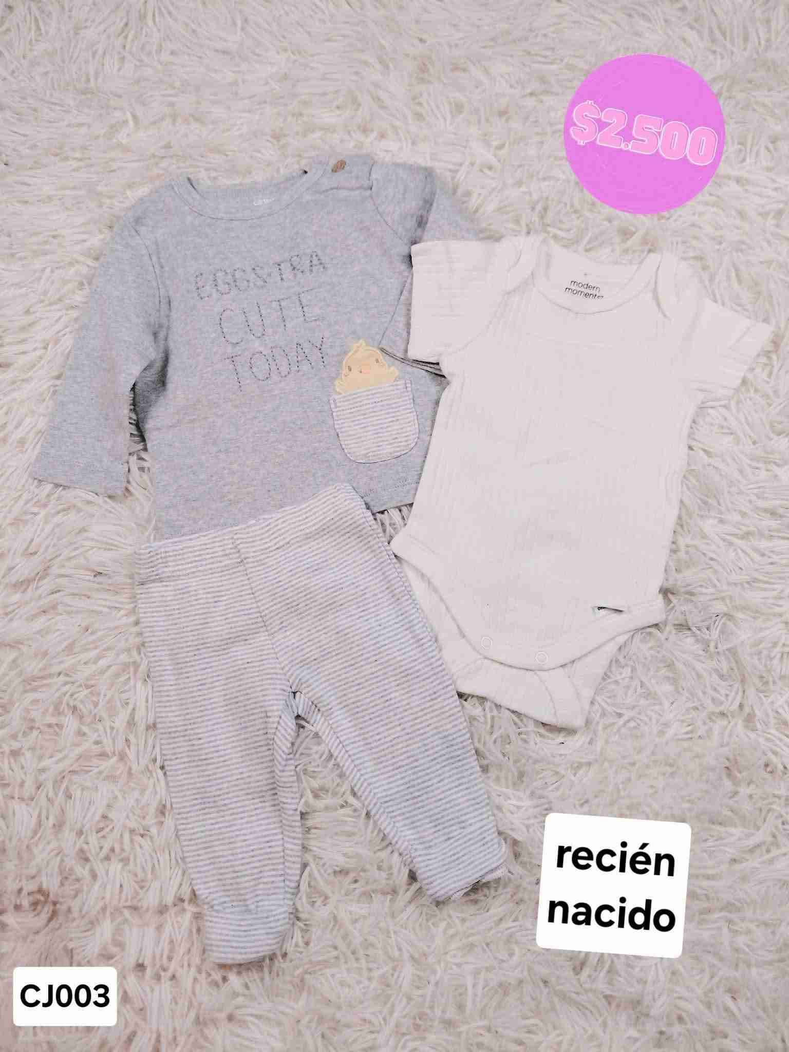 Conjunto de ropa para recién nacido, incluye body, pantalón y camiseta en tonos grises. Ideal para el día a día del bebé. Usada en perfecto estado.