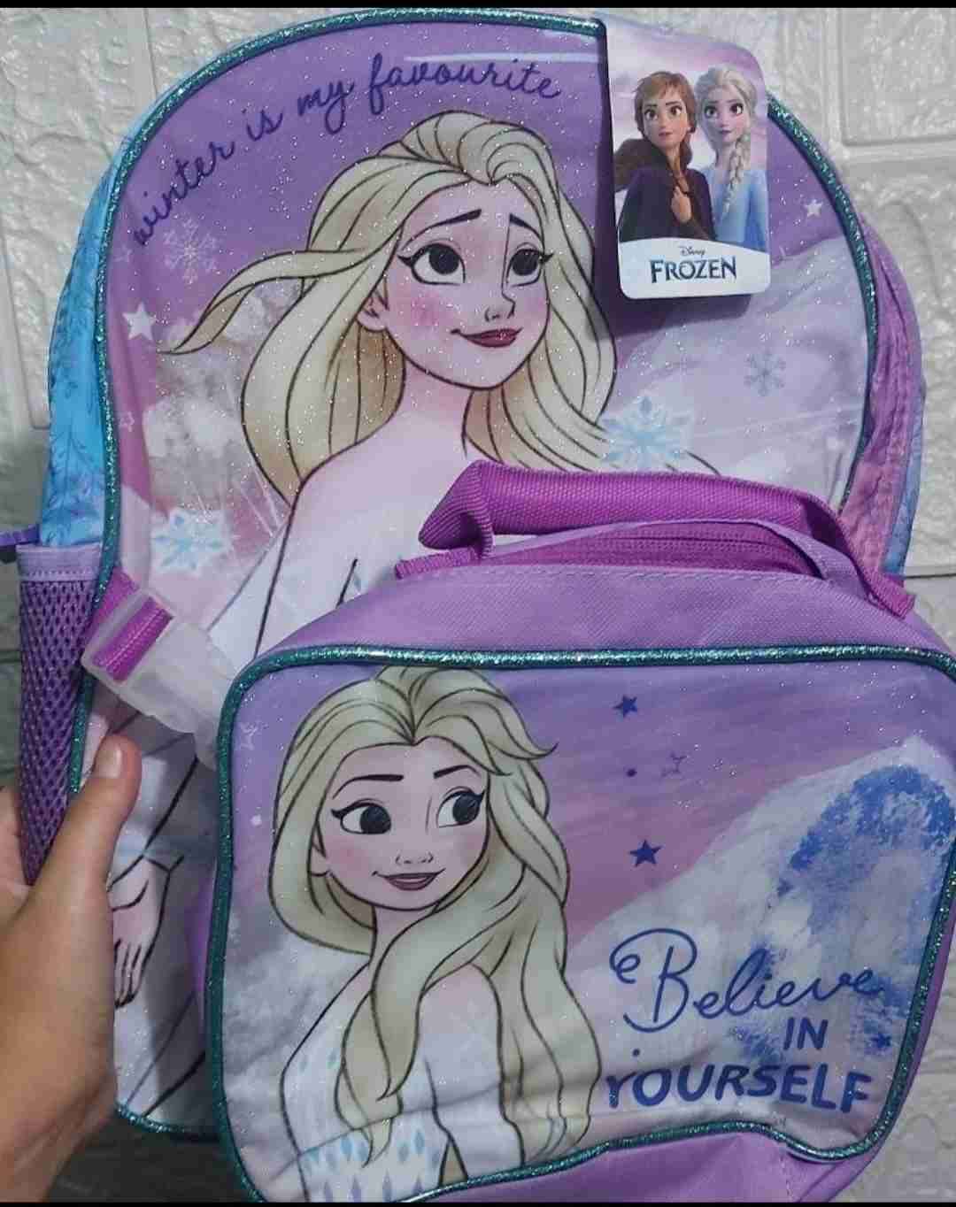 Conjunto de mochila y lonchera con diseño de Frozen, ideal para la escuela. En buen estado y fácil de llevar.