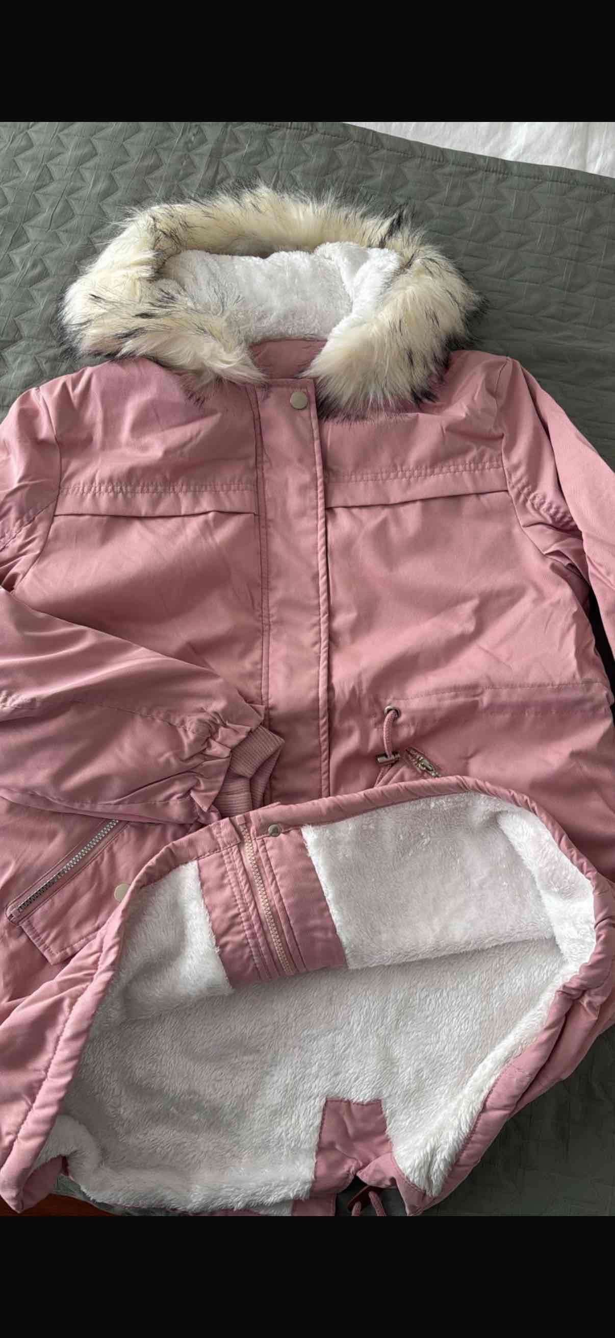 Abrigo rosado de estilo parka con capucha de pelaje sintético. Ideal para el invierno. Nueva sin uso Talla 2XL