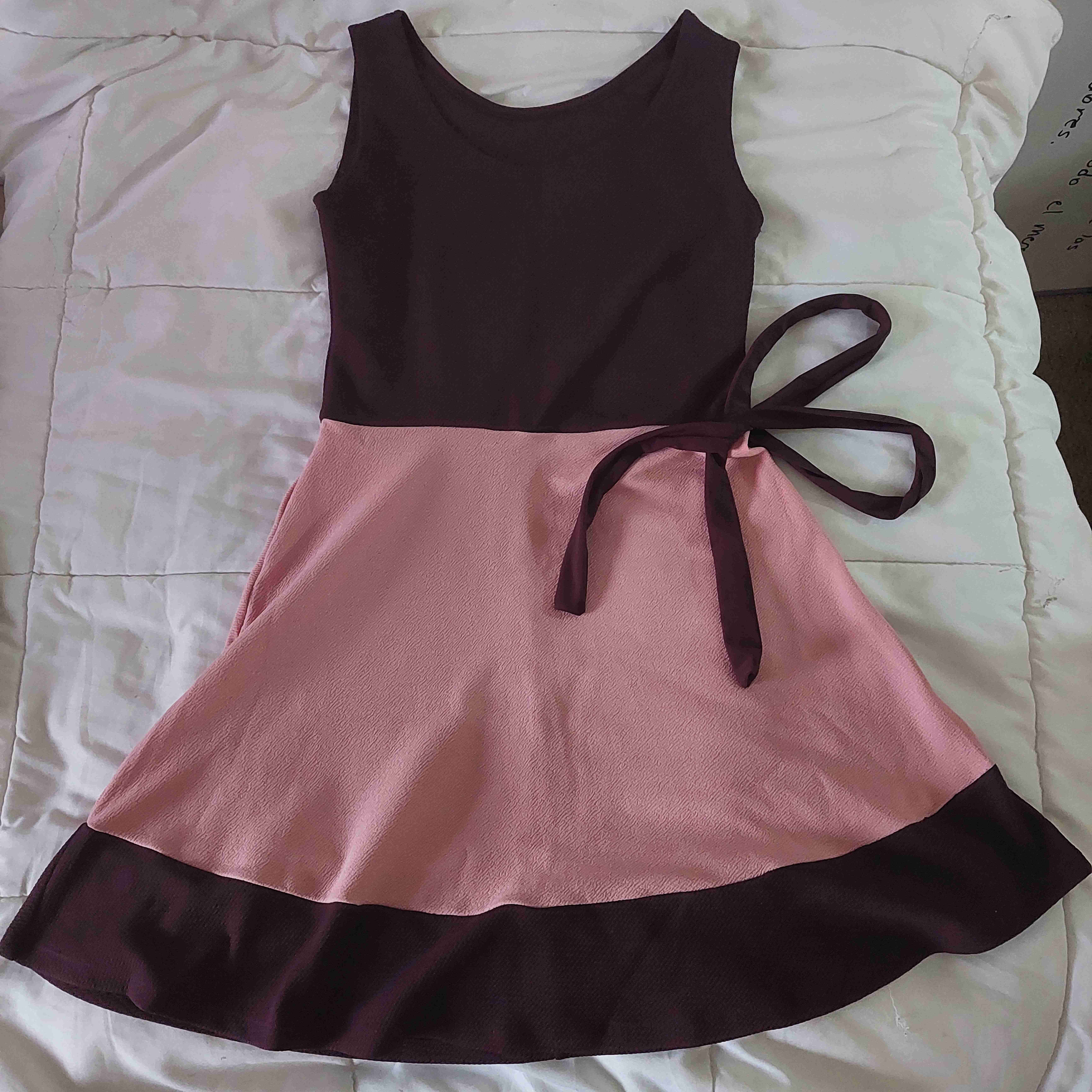 Vestido elegante bicolor en tonos rosa y marrón, con detalle de lazo en la cintura. Ideal para ocasiones especiales. Talla s elasticado.