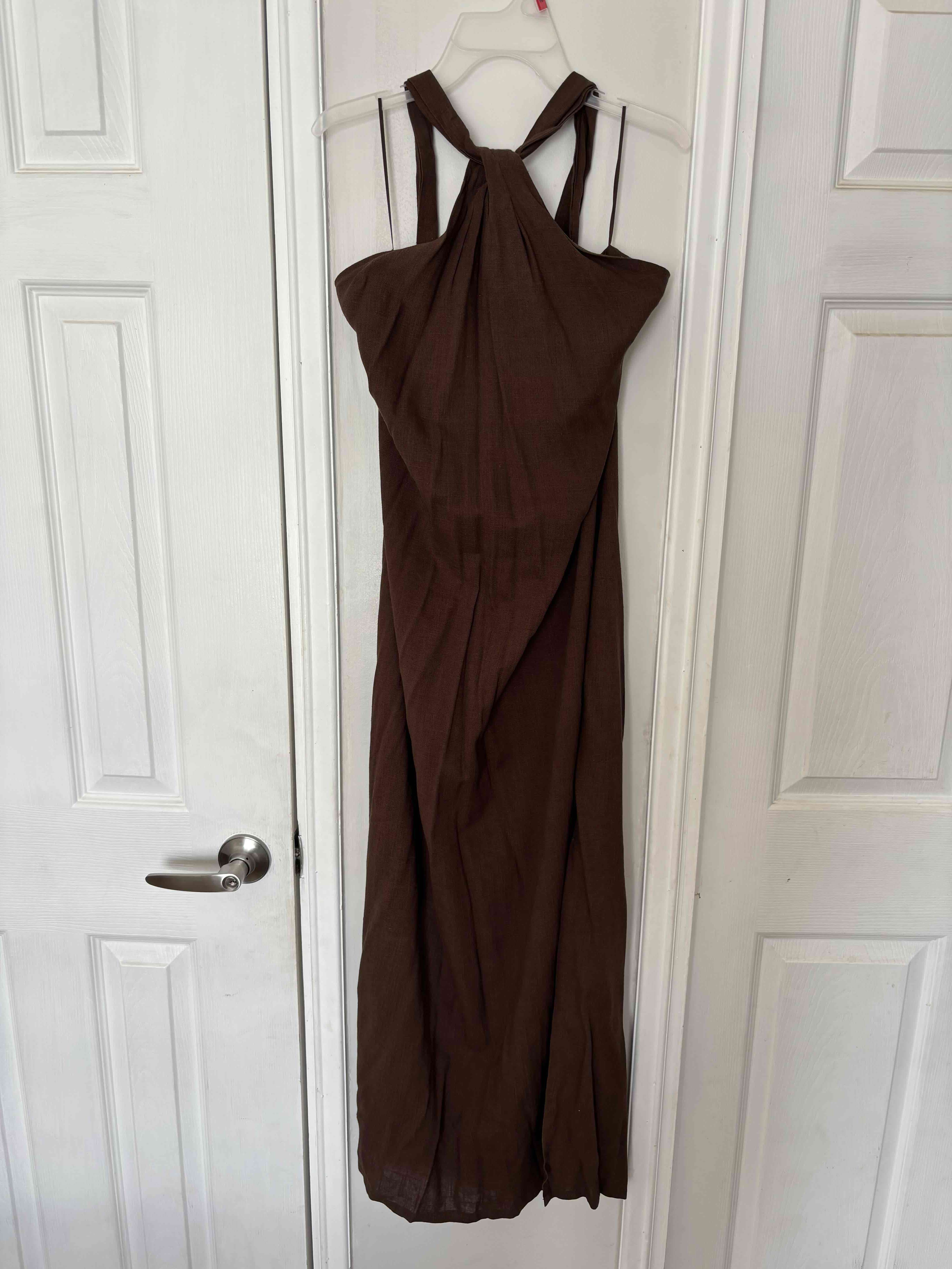 Vestido largo marrón con diseño cruzado, ideal para ocasiones formales o cenas elegantes. En buen estado general.
