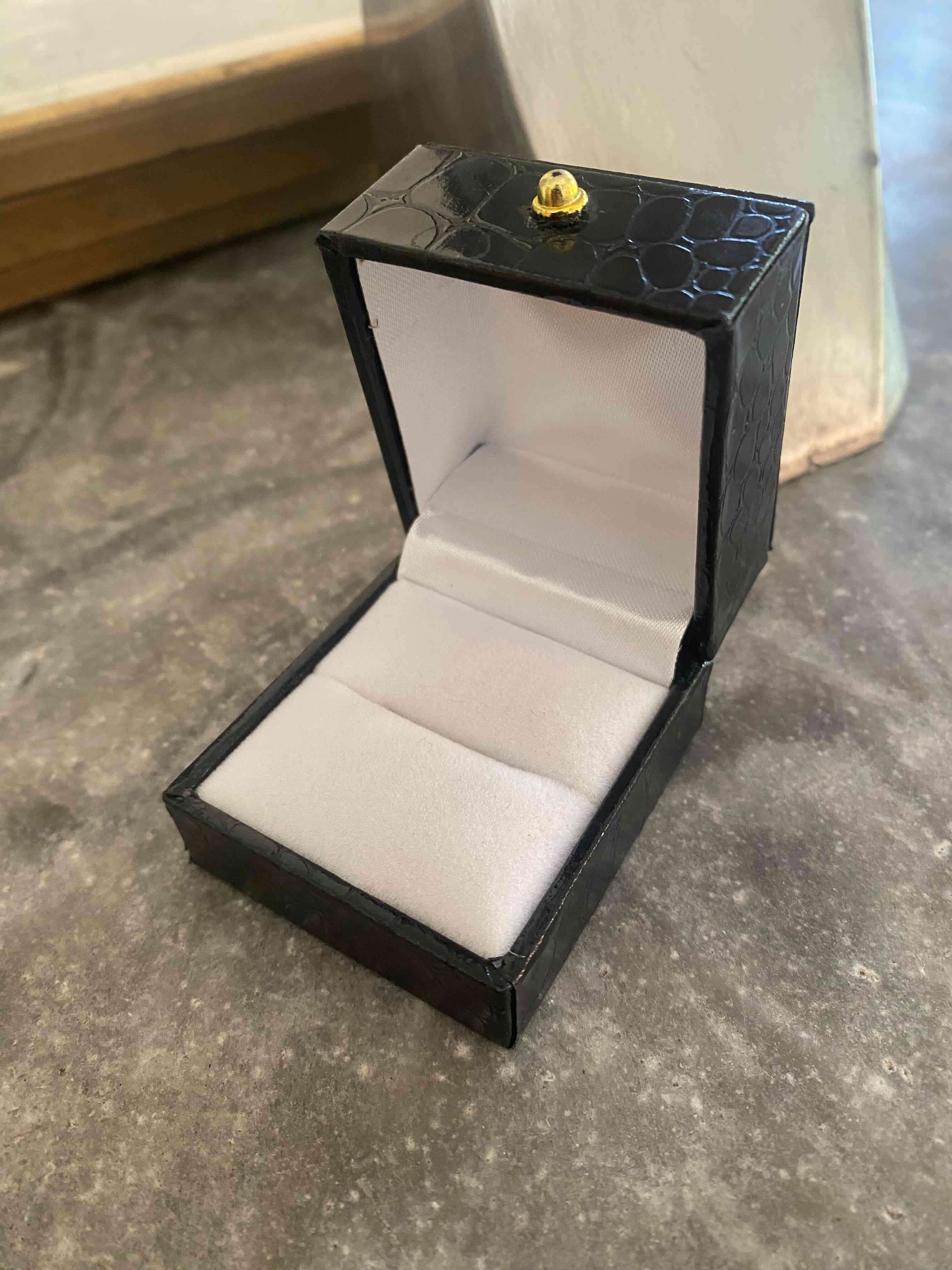 Estuche elegante de color negro con interior blanco. Ideal para guardar anillos o de regalo. En buen estado con detalles mínimos.