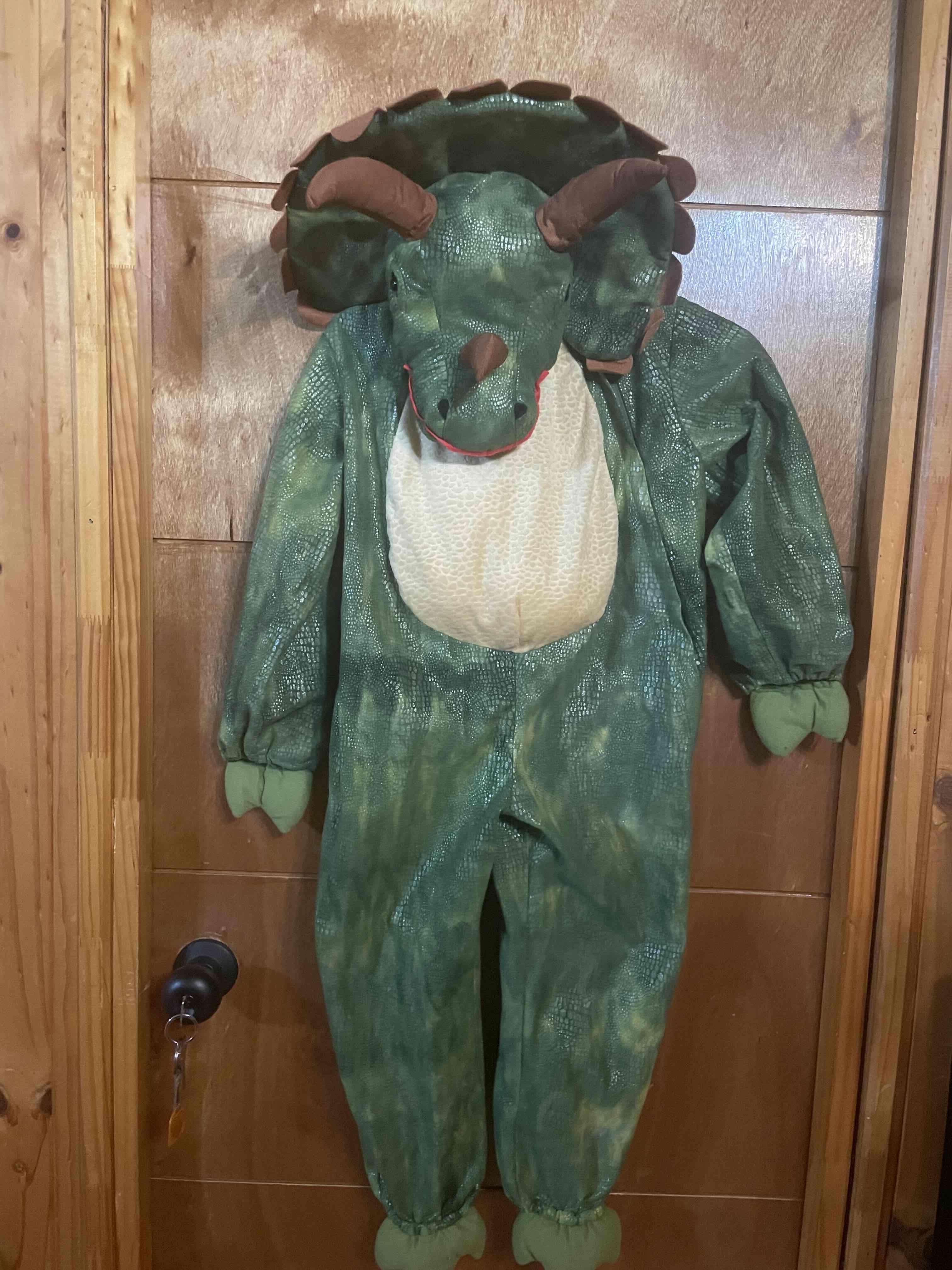 Divertido disfraz de dinosaurio para niños, en tonos verdes con detalles de cuernos. Perfecto para fiestas de disfraces o Halloween.
