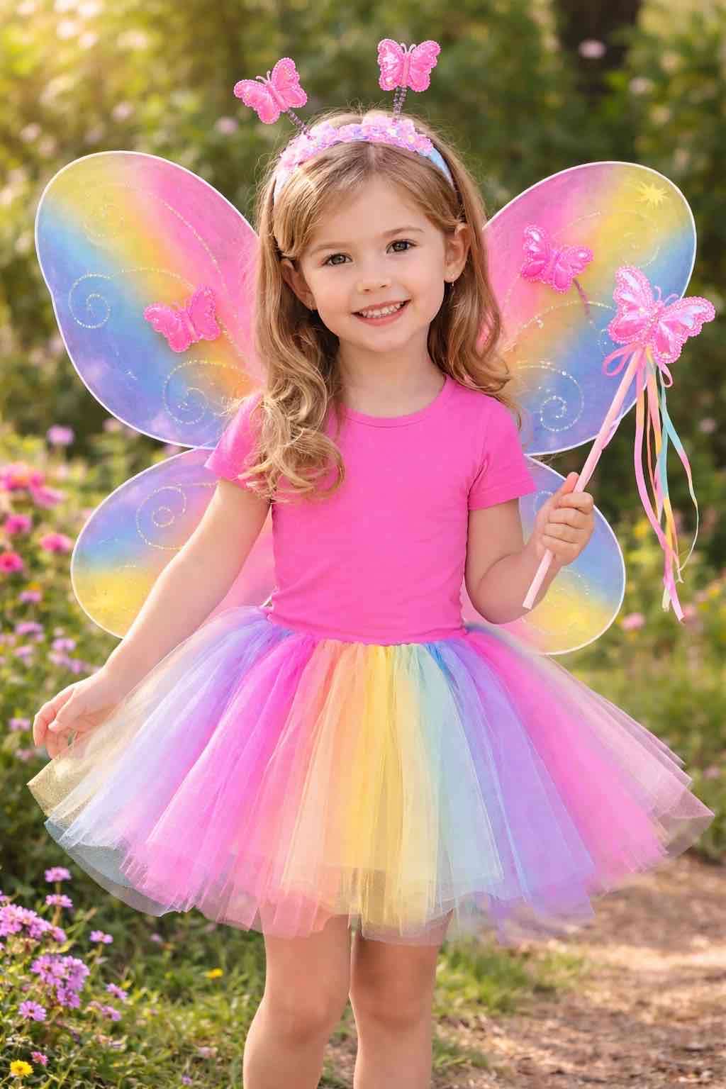 Hermoso disfraz de mariposa para niñas, con alas y falda multicolor. Ideal para niña de 3 a 6 años. Perfecto para fiestas y juegos. Producto Nuevo. Incluye: 1 alas mariposa 1 tutu 1 Cintillo 1 varita mariposa.