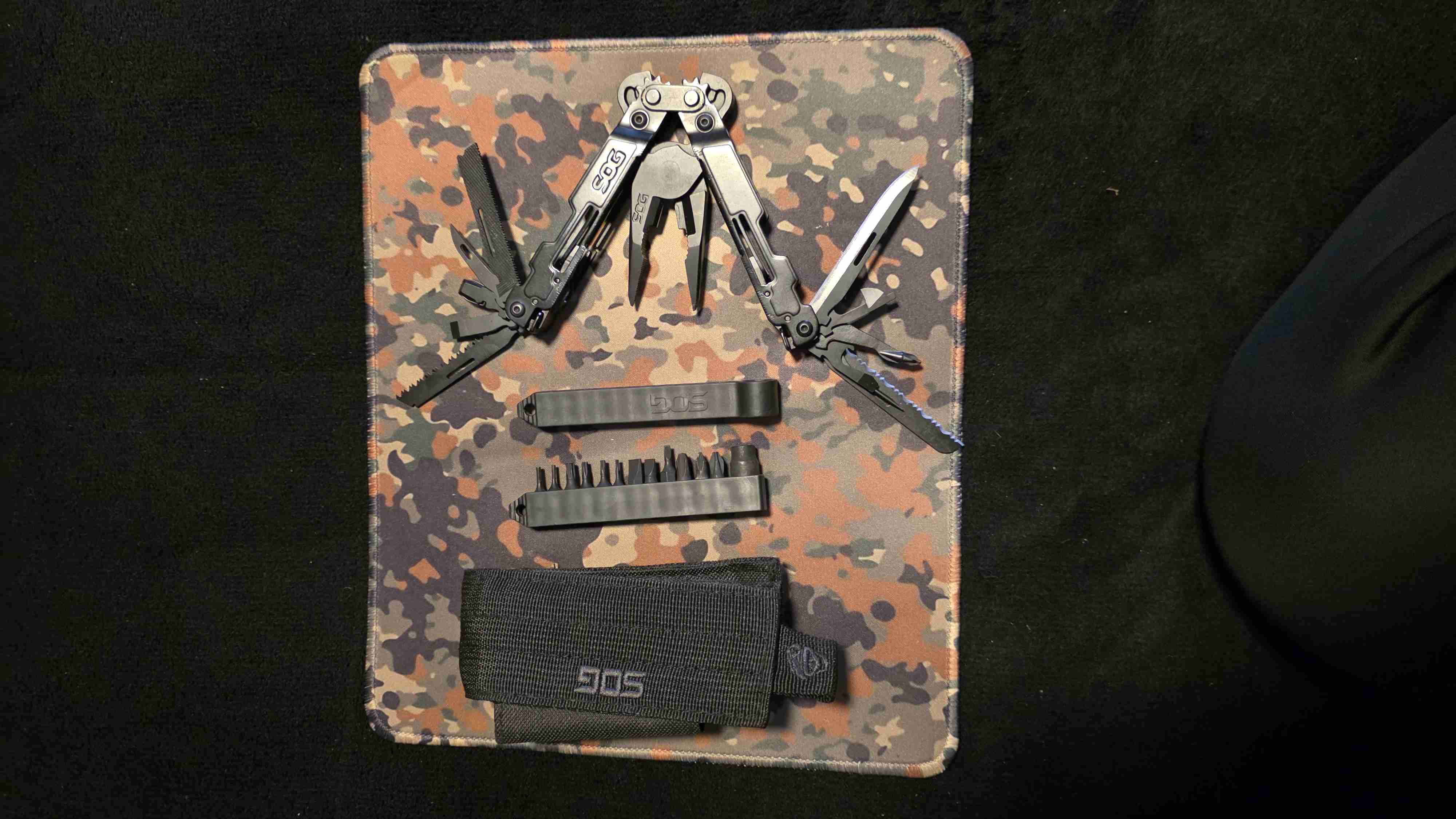 Herramienta multifuncional SOG access deluxe en buen estado. Incluye funda de transporte y adaptadores. Ideal para actividades al aire libre y reparaciones.