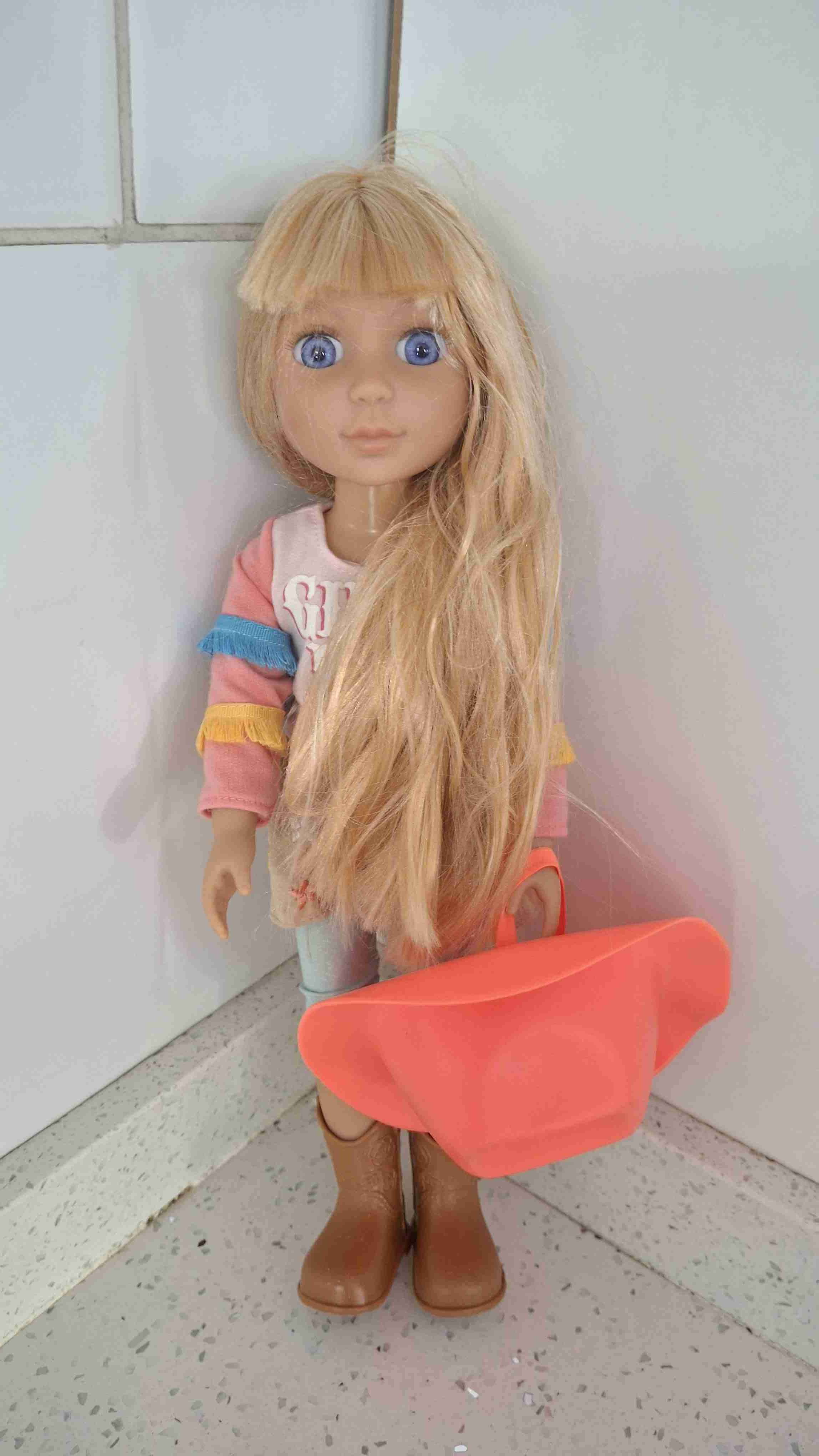 Muñeca con cabello rubio largo y ojos azules. Lleva botas y un vistoso sombrero rojo, ideal para juegos de simulación.