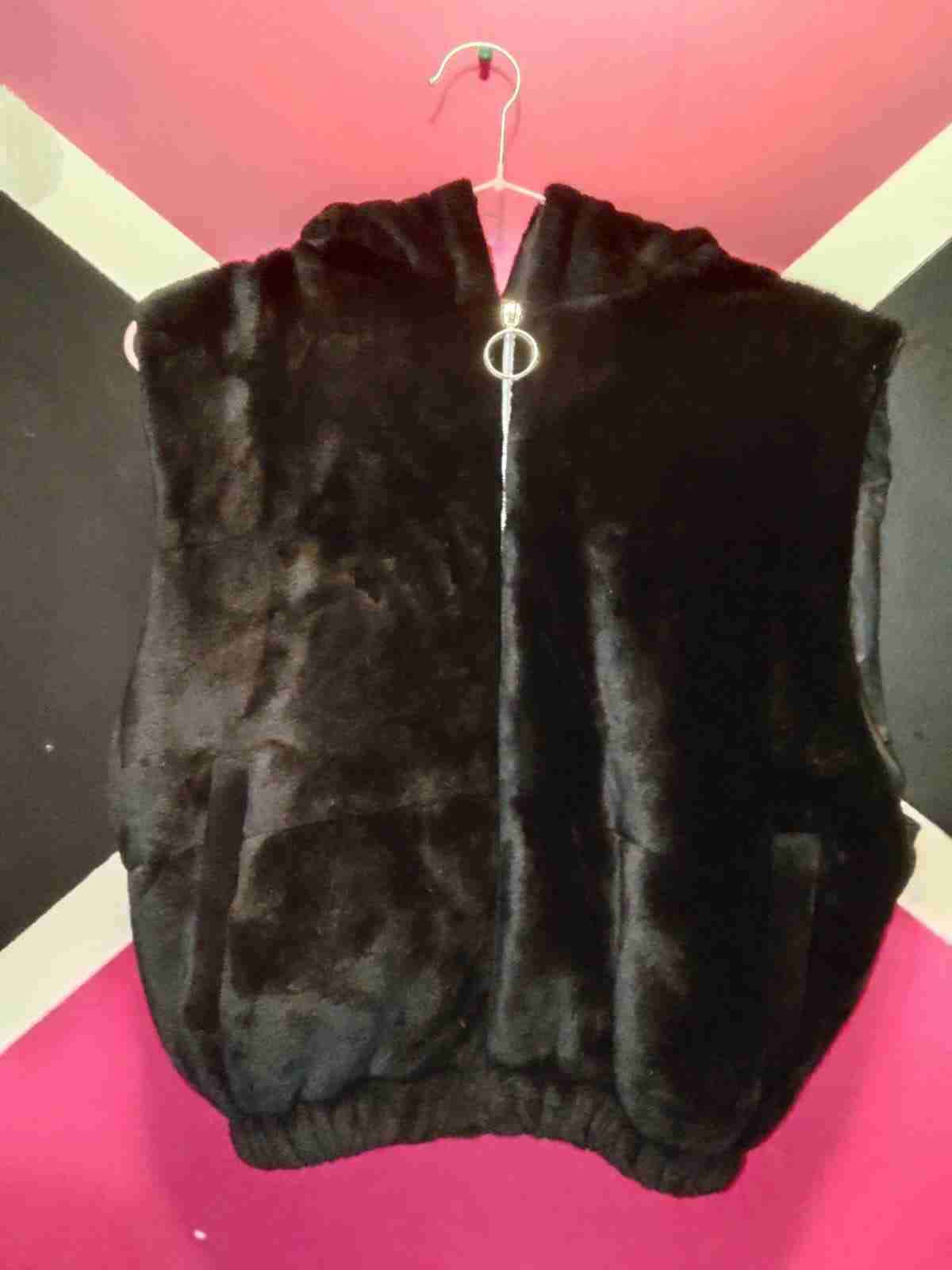 Chaleco sin mangas de piel sintética en color negro. Perfecto para el invierno,linda y comoda, en buen estado general.