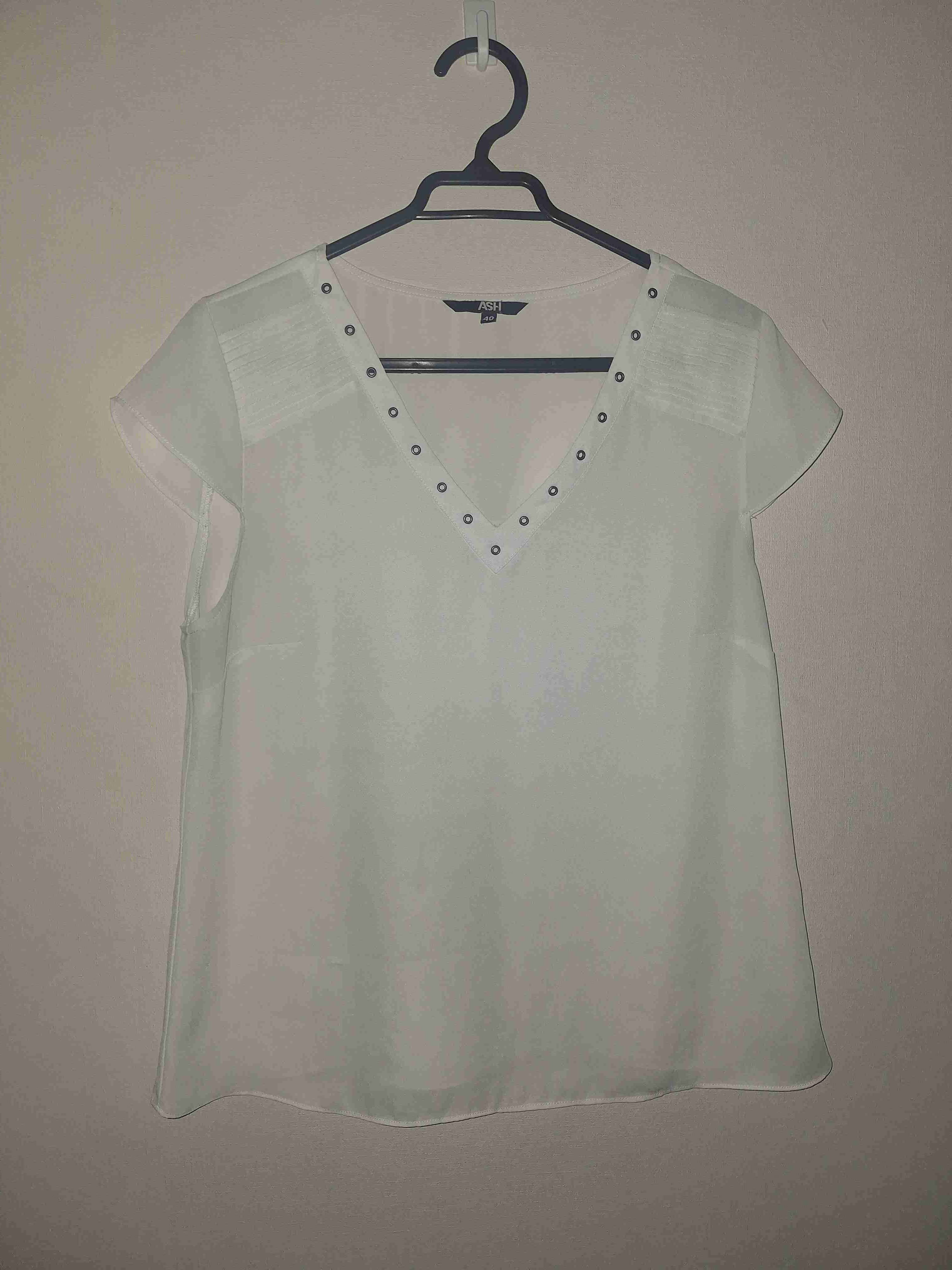 Blusa de mujer blanca con detalles de tachas en el escote en V. Perfecta para ocasiones casuales o formales. En buen estado.