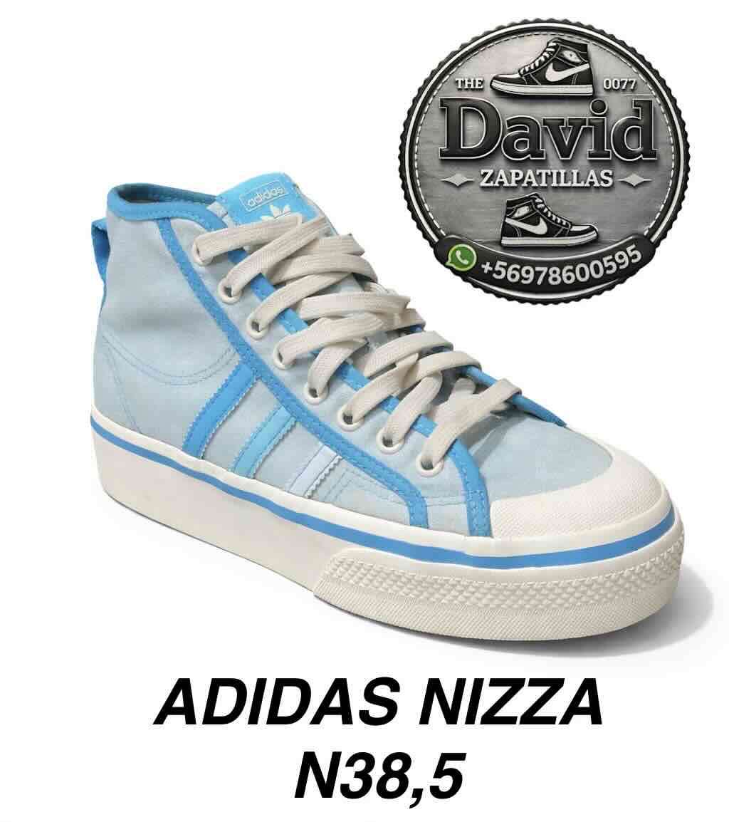 Zapatillas Adidas Nizza en color celeste con detalles azules. En buen estado, ideal para el uso diario.
