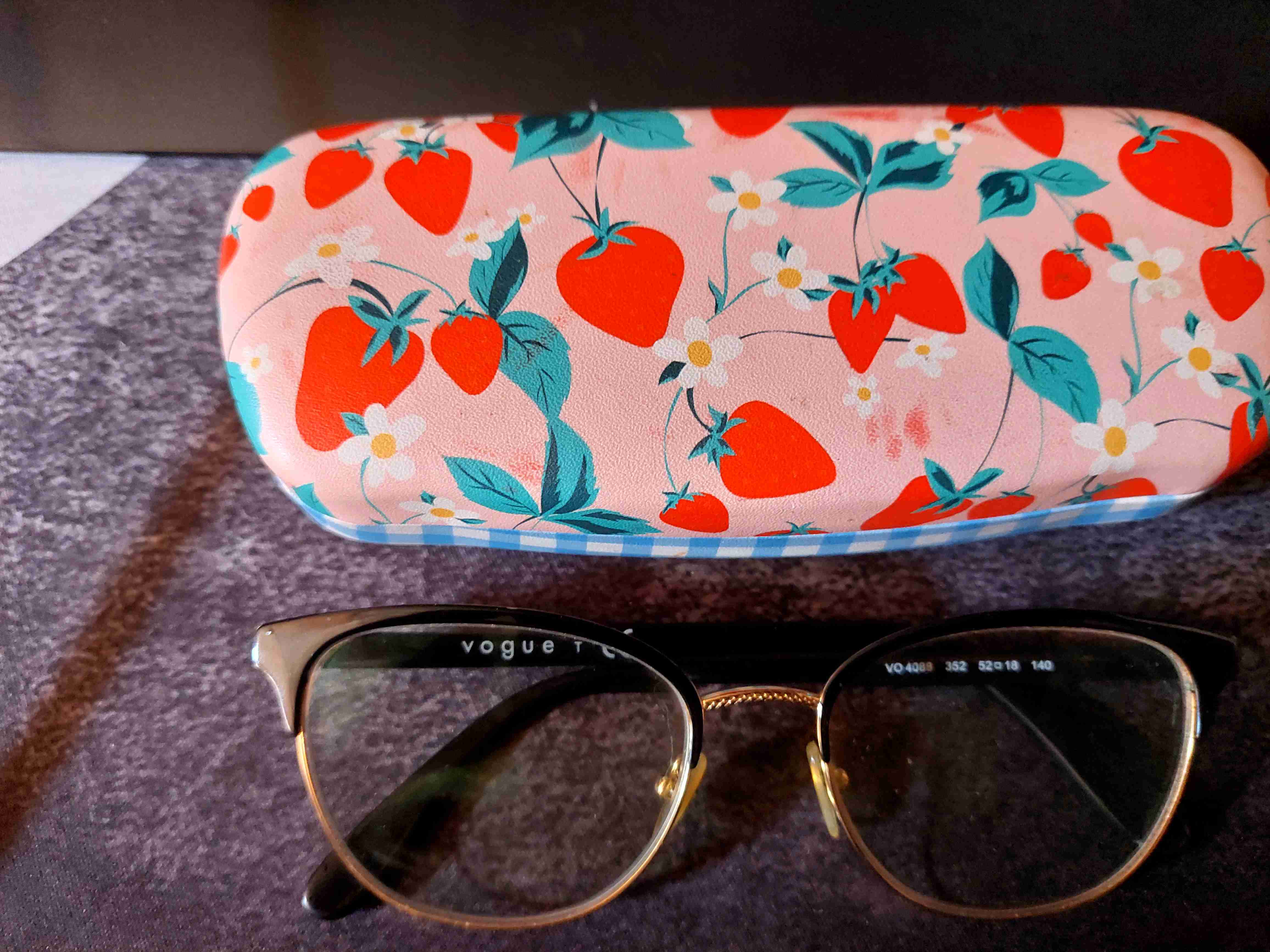 Lentes de marco negro elegantes con un encantador estuche rosado de diseño de frutillas. En buen estado, ideal para uso diario.