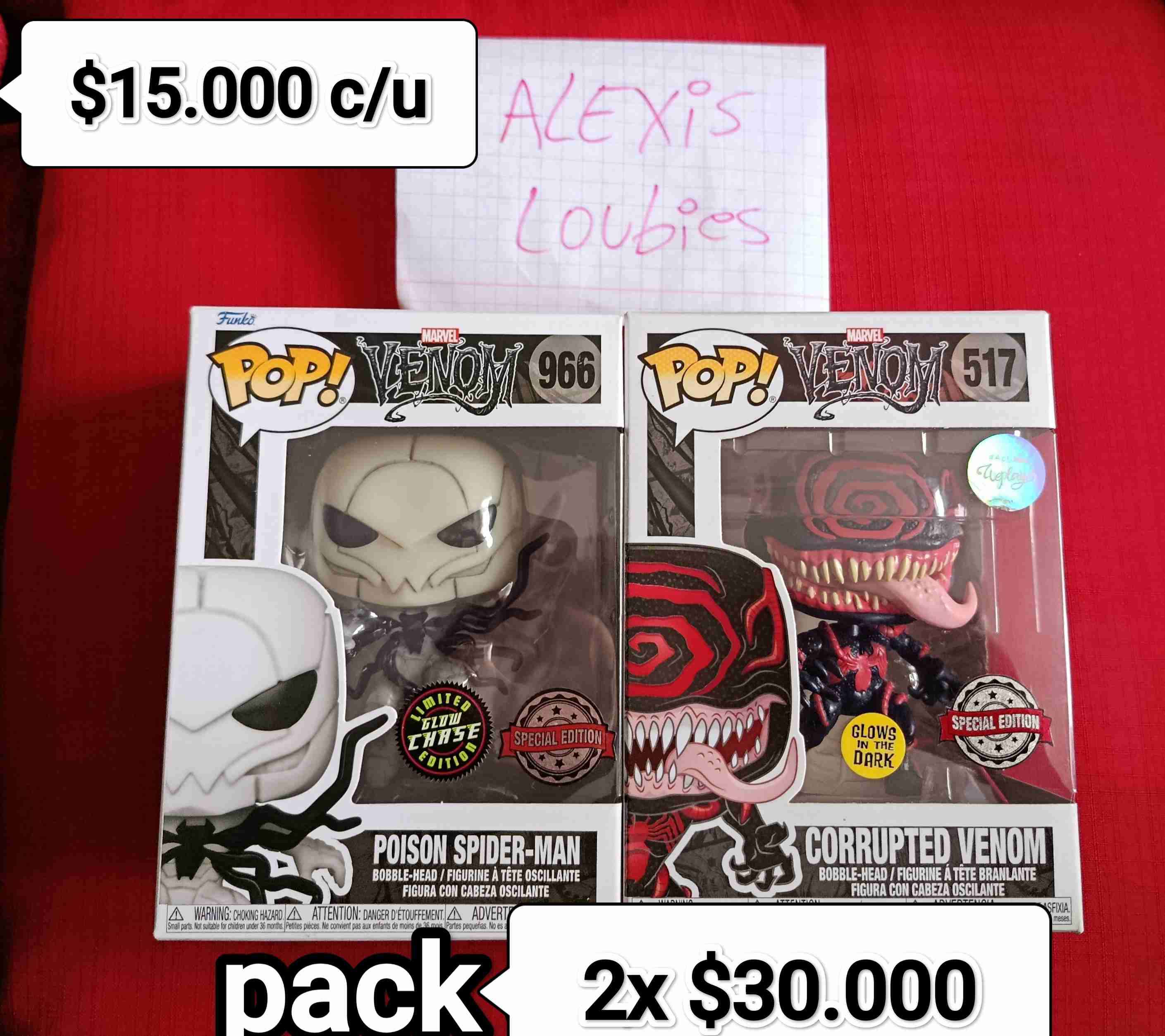 Pack de dos figuras Funko Pop edición especial de Venom. Incluye Poison Spider-Man y Corrupted Venom, ambas con detalles brillantes. Excelente para coleccionistas.