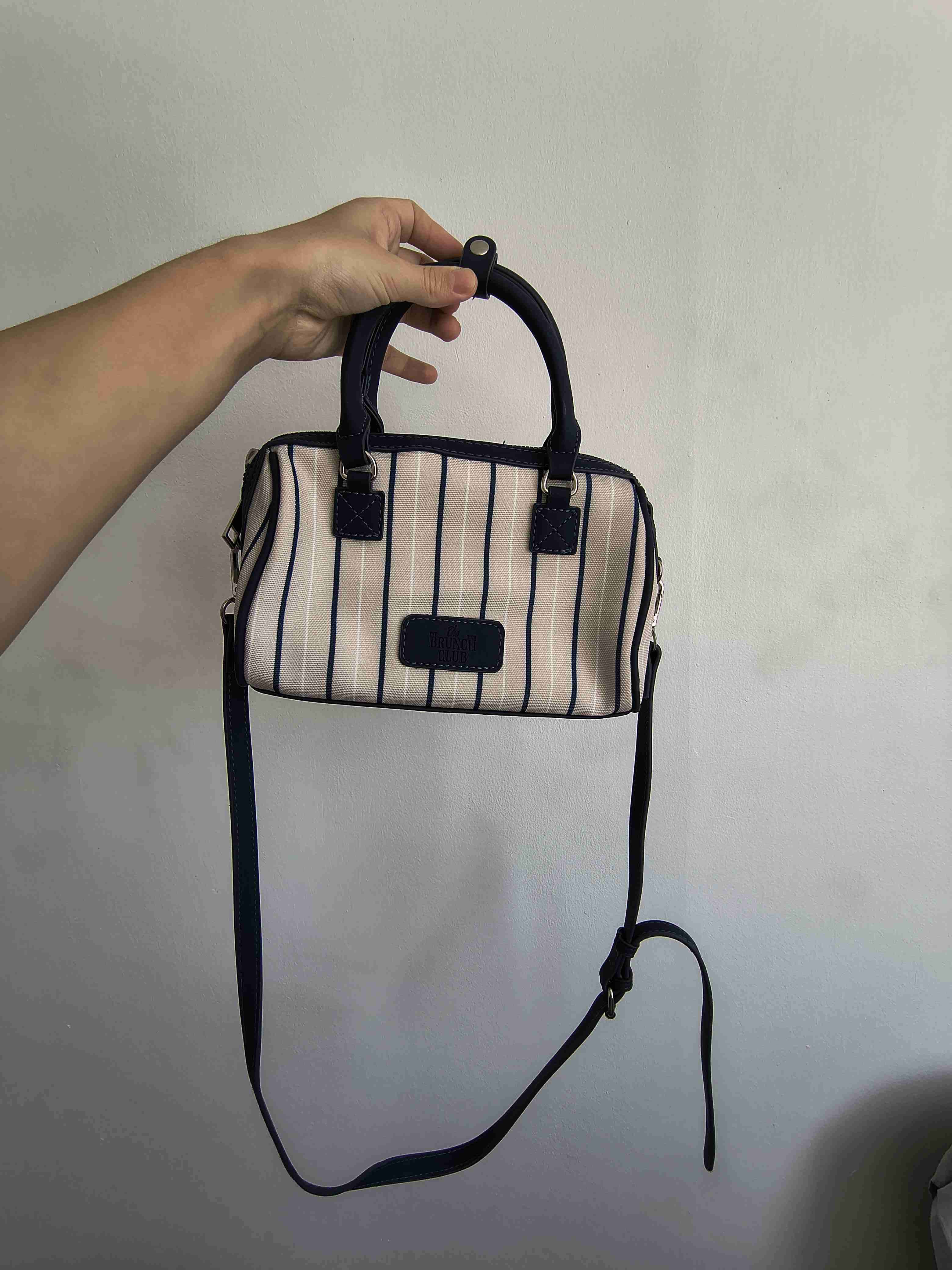 Bolso pequeño de rayas azul marino y blancas, ideal para el uso diario. En buen estado general