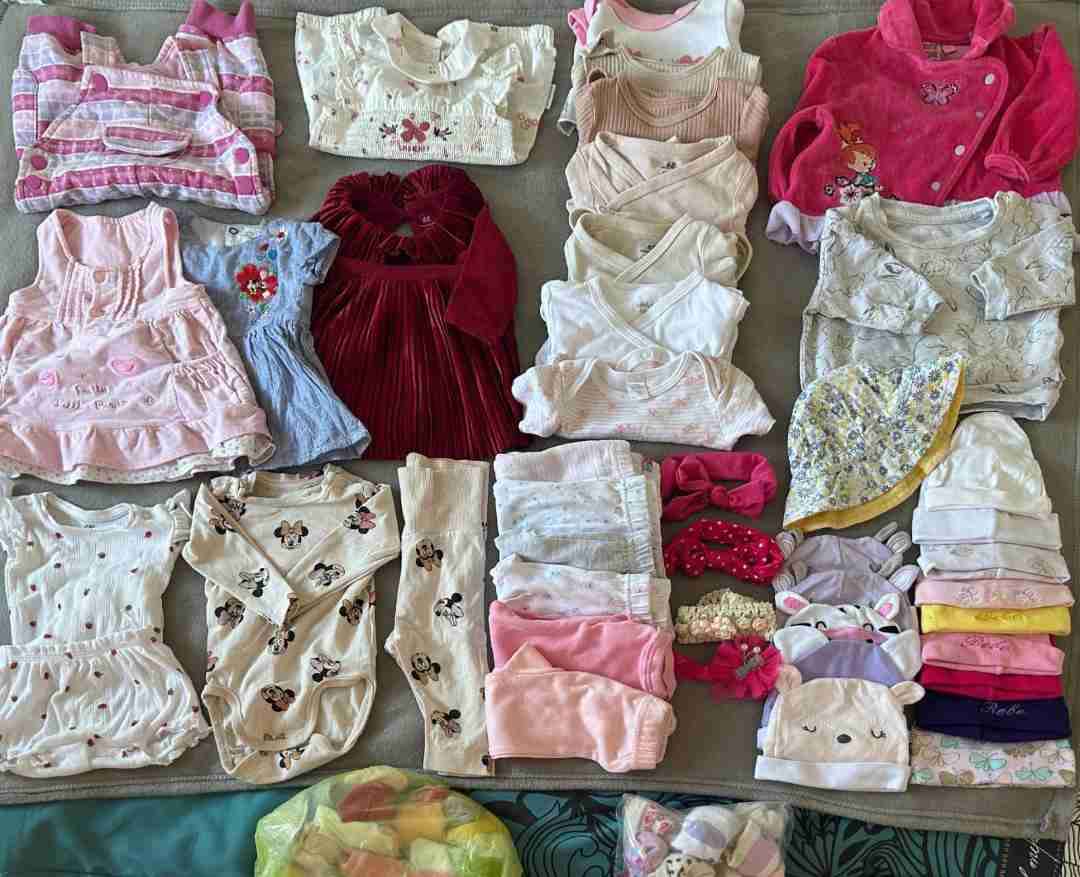 Vendo lote de ropa niña de 0-3 meses incluye lo siguiente: - jardinera - enterito - 3 vestidos - conjunto fresas - conjunto Minnie Mouse - 6 bodys manga larga - 1 body manga corta - 6 pantys - 2 chalecos - 14 gorritos - 1 sombrero para el sol reversible - 4 cintillos - mitones y calcetines Incluye marcas como H&M, Infanti, Yampi, Ficcus, Colloky, entre otras.