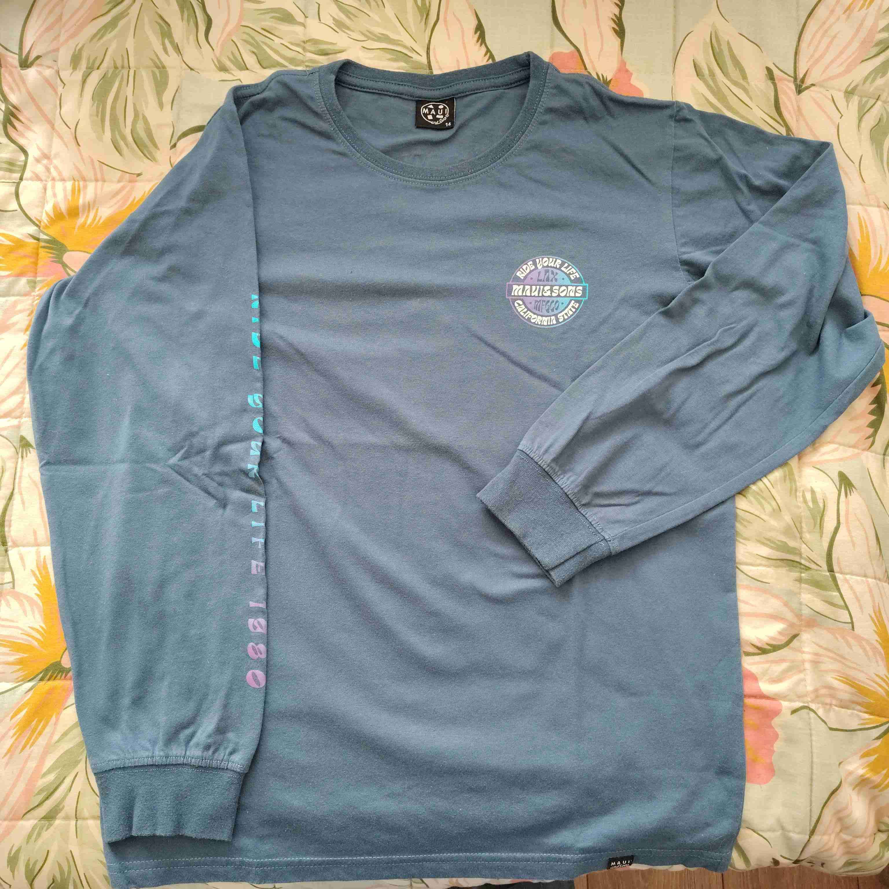 Polera azul marca Maui, talla 14, con diseño gráfico, mangas largas y estilo casual. Buen estado.