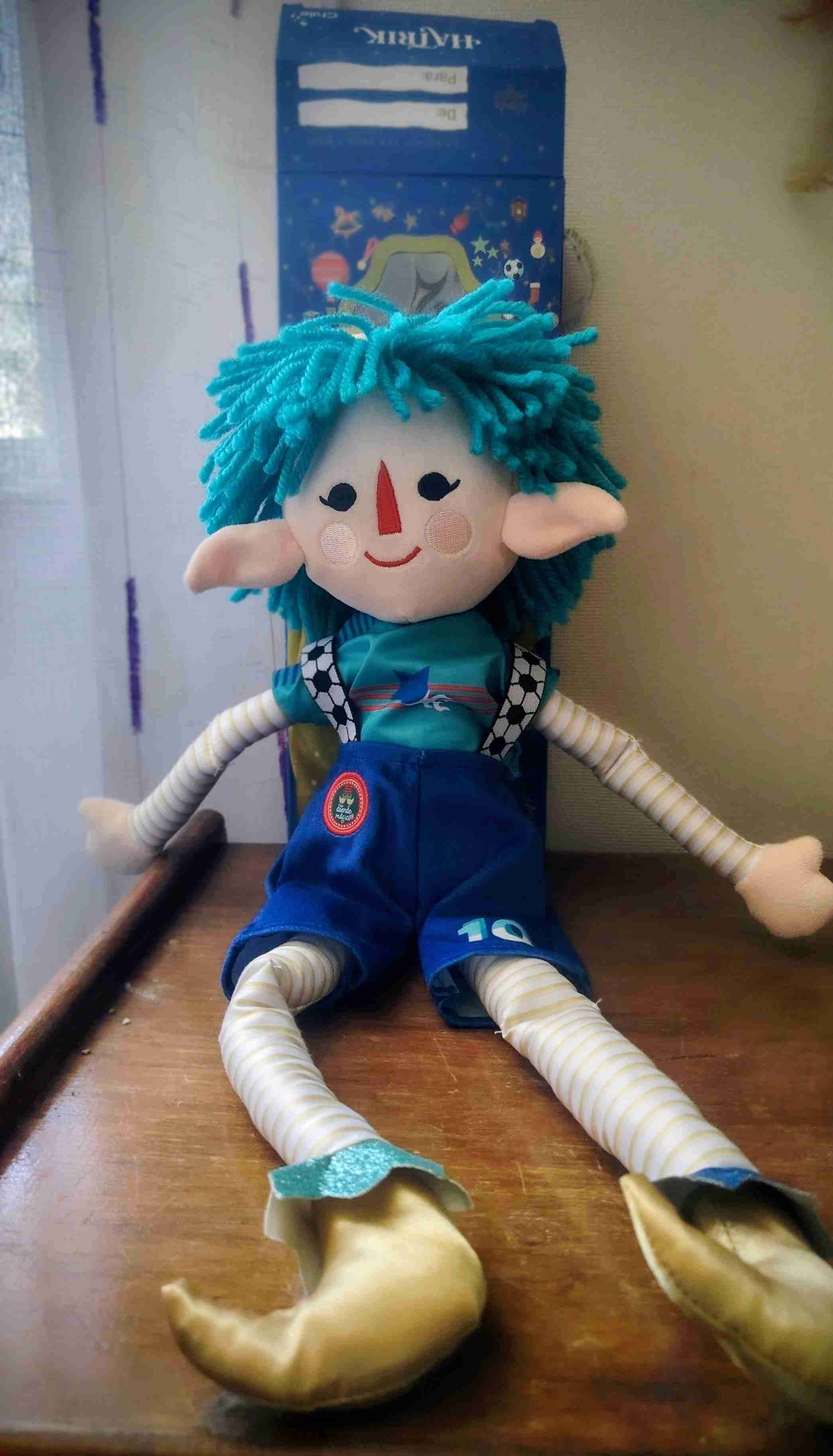 Duende mágico de tela suave, ideal para niños. Cabello azul y ropa colorida. En buen estado.