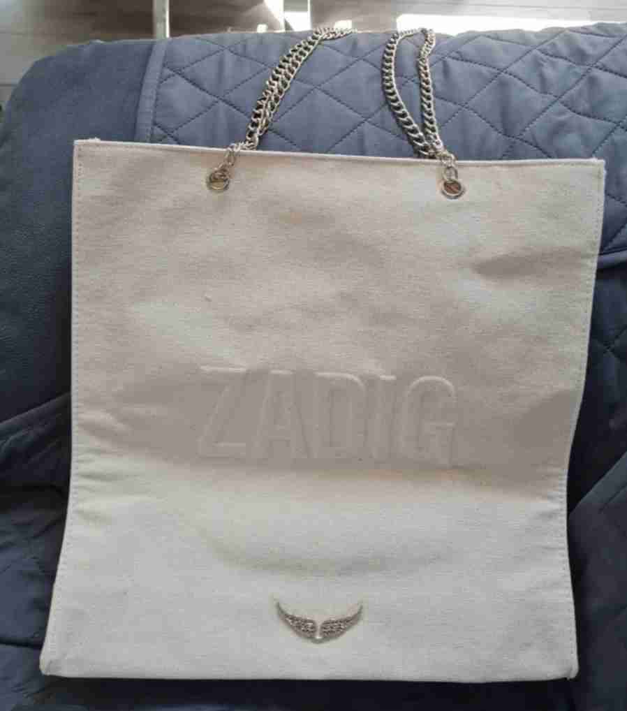 Bolso de la Marca Zadig & Voltaire elegante de tela color beige. Perfecto para el uso diario o salidas casuales. ✨ Asa de cadena Metálica. ✨ Diseño elegante y minimalista. ✨ Logotipo de la marca grabado en relieve.