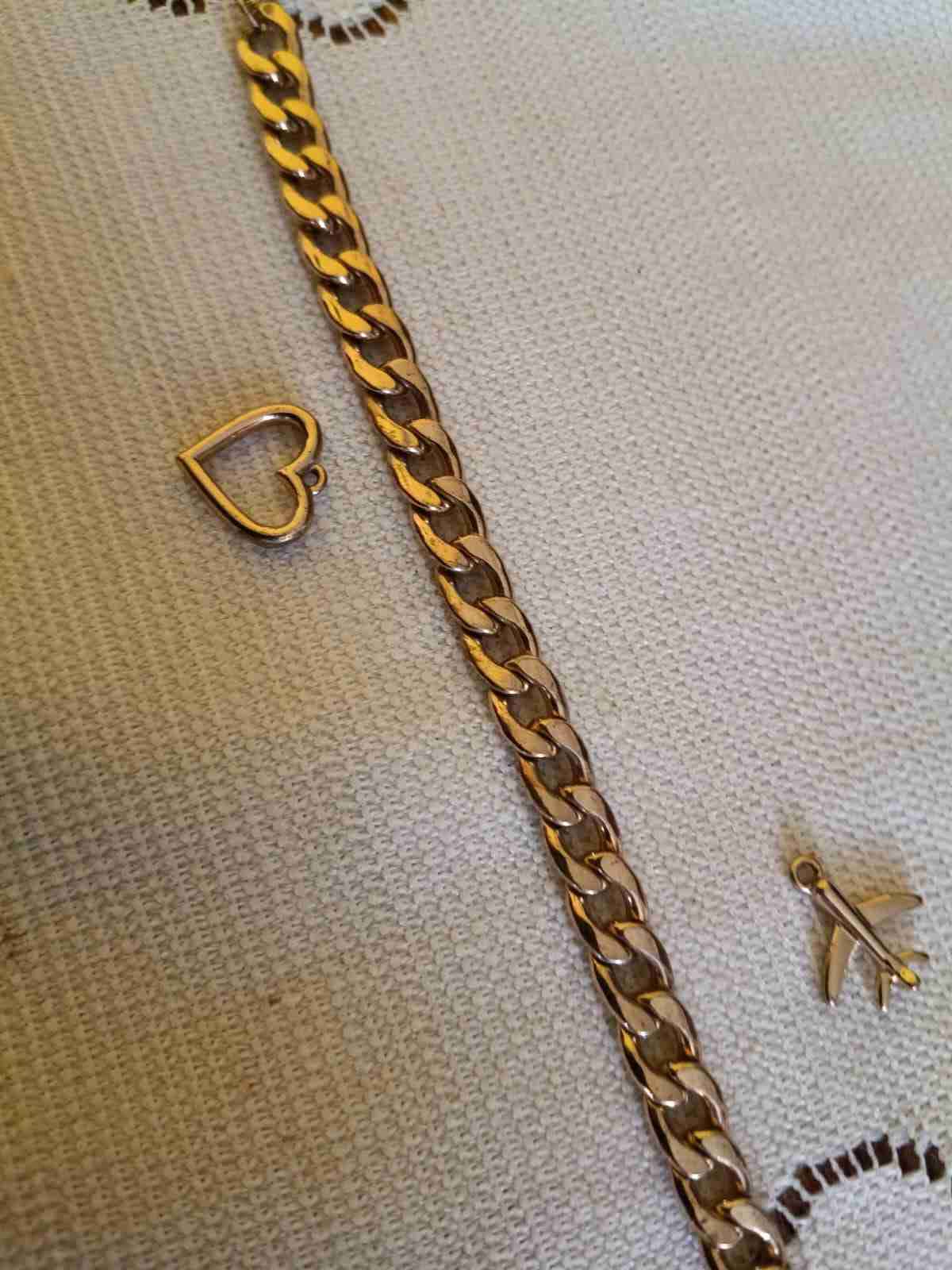 Pulsera dorada elegante con dijes de corazón y avión. Ideal para un look casual o elegante.