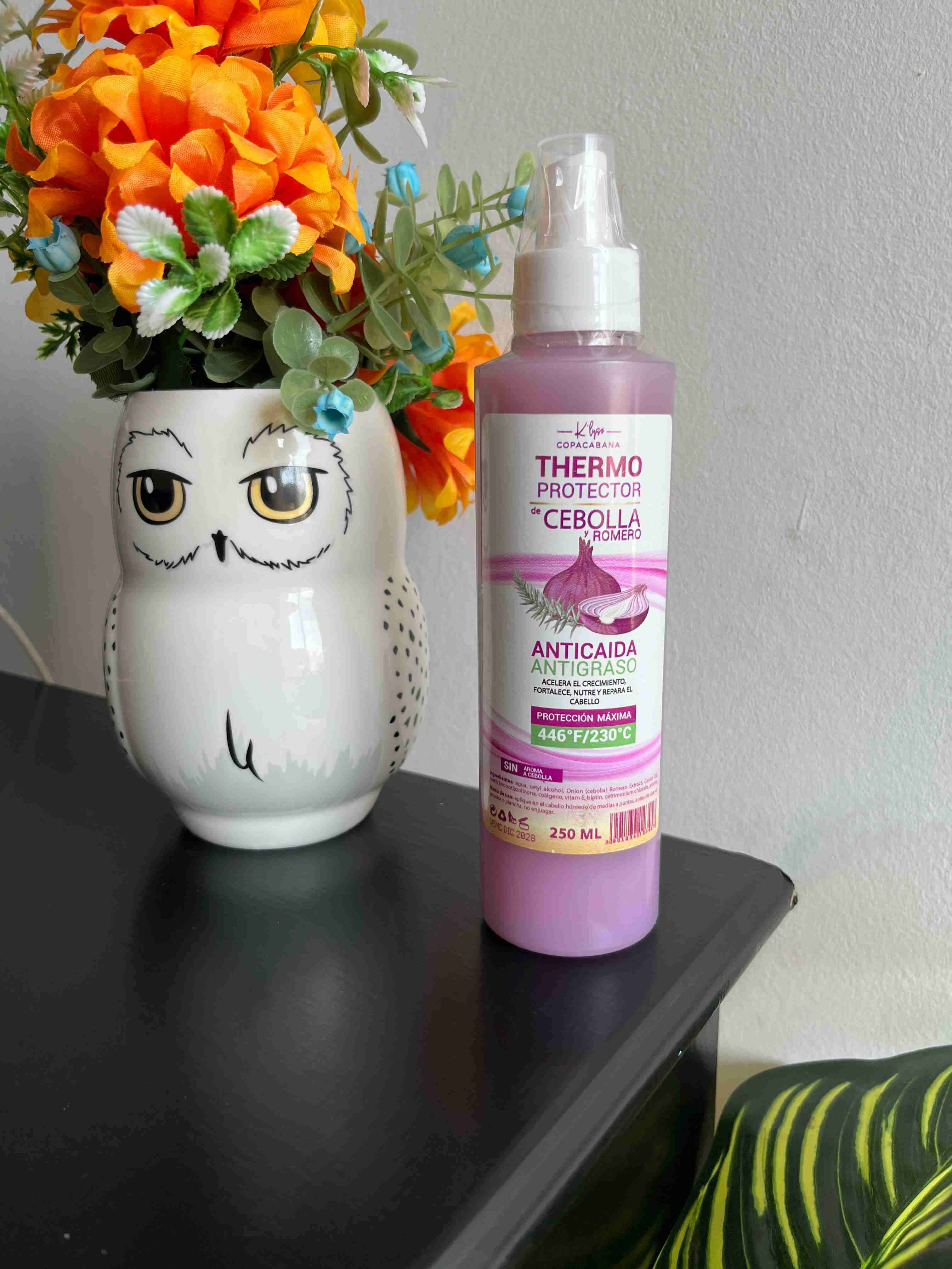 Spray protector térmico con extracto de cebolla y romero. Ideal para fortalecer el cabello contra el calor.