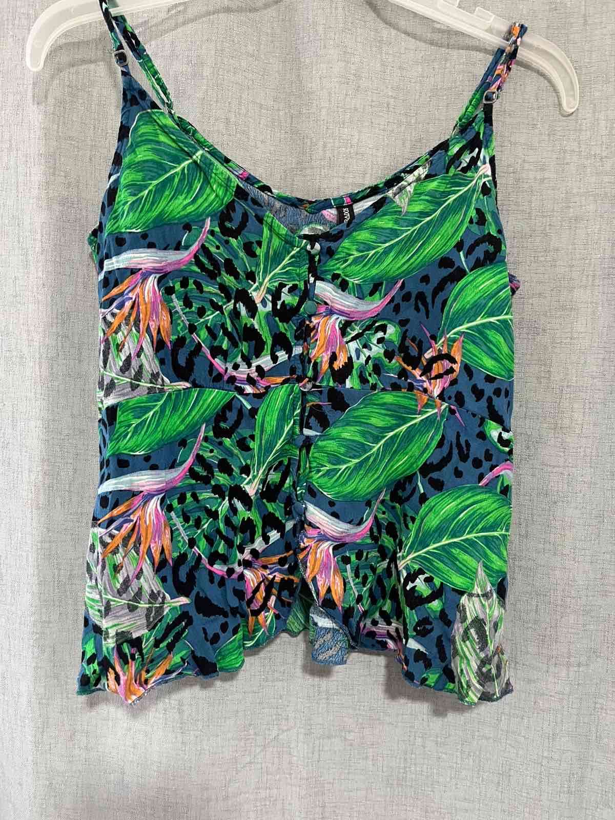 Polera con diseño tropical y tirantes ajustables, ideal para el verano. Se encuentra en buen estado.