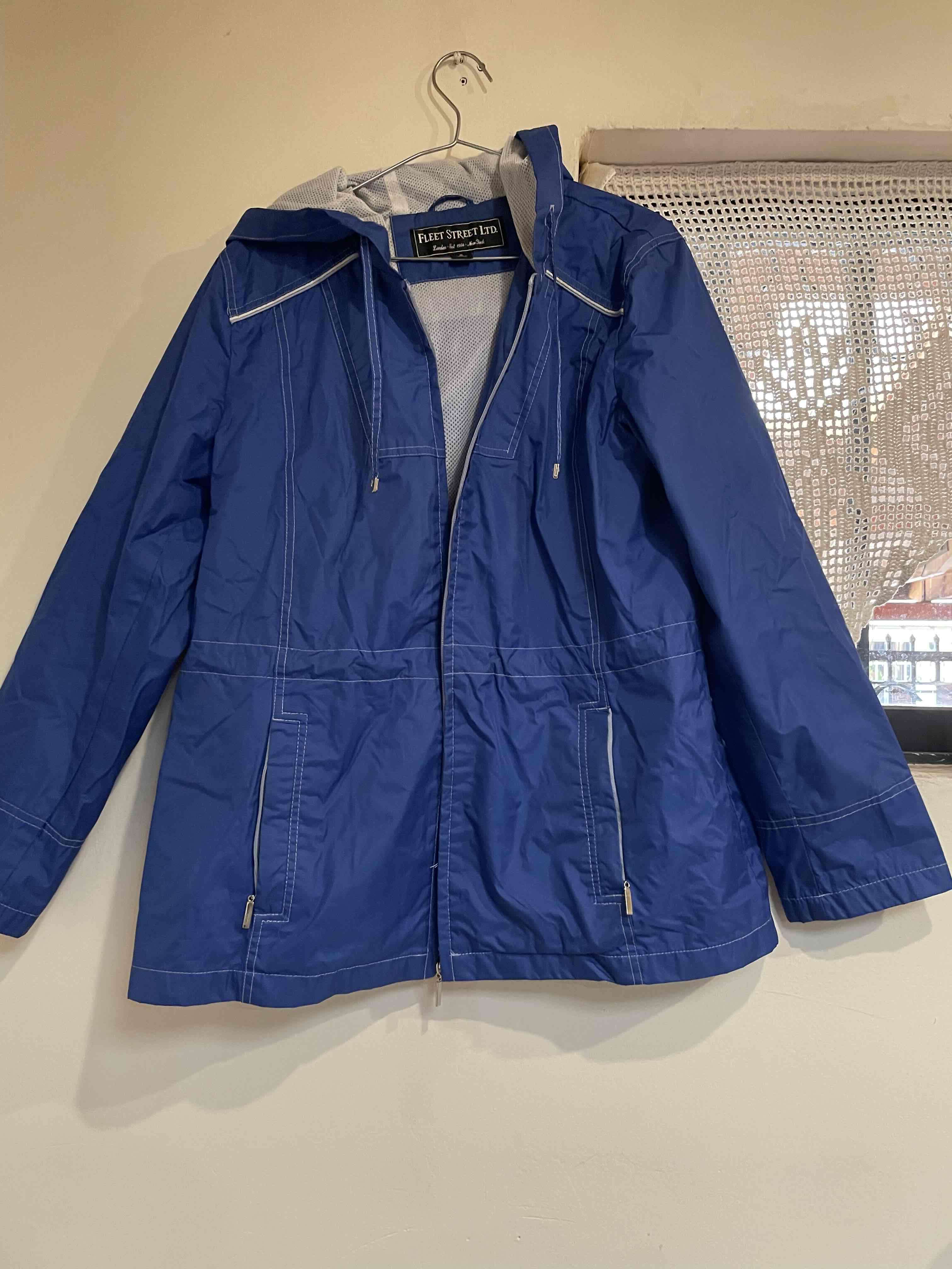 Chaqueta azul con capucha y cierre, ideal para días de lluvia. En buen estado, con signos mínimos de uso.