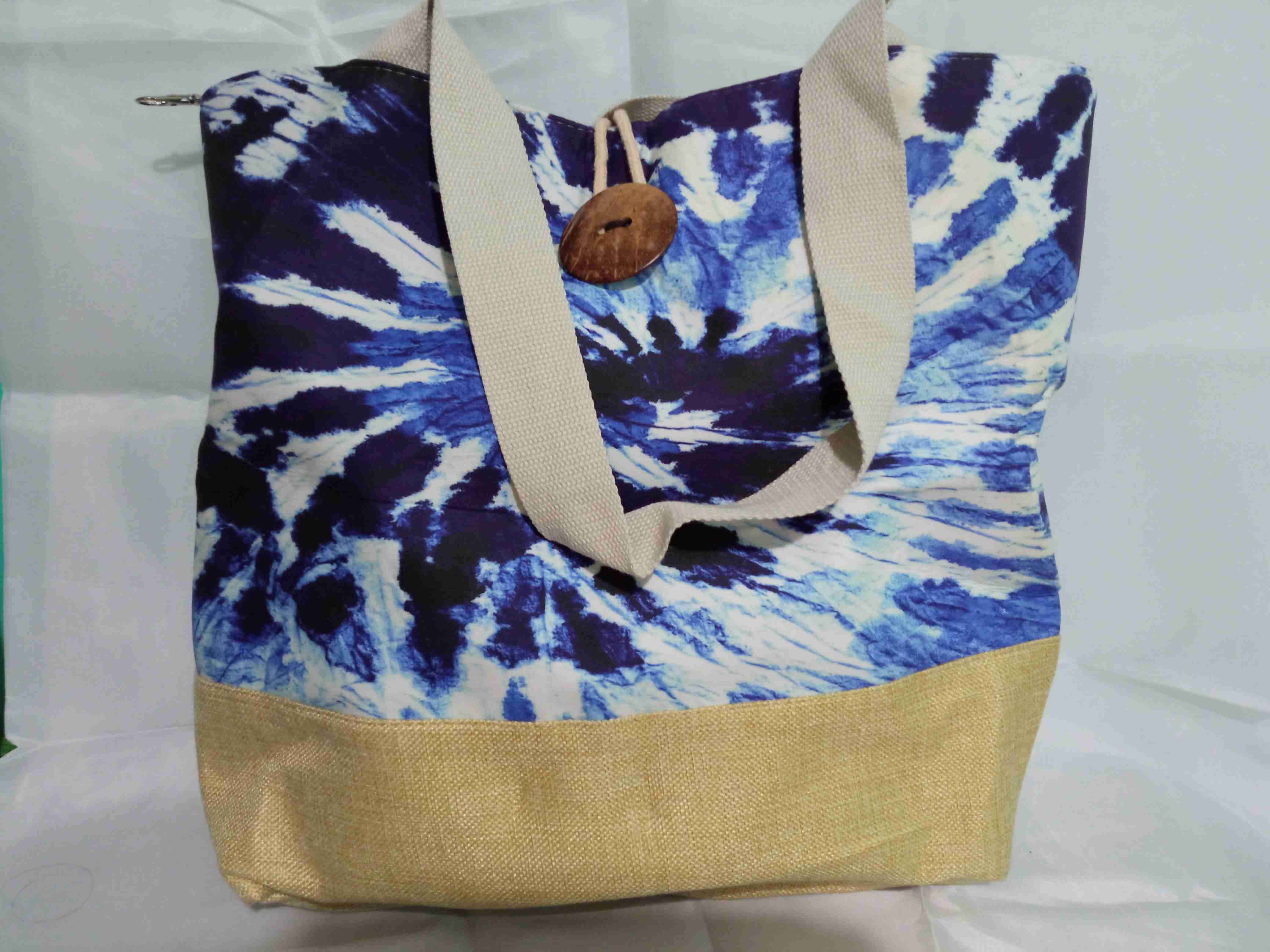 Bolso grande con diseño tie-dye azul y fondo beige. Ideal para el día a día.