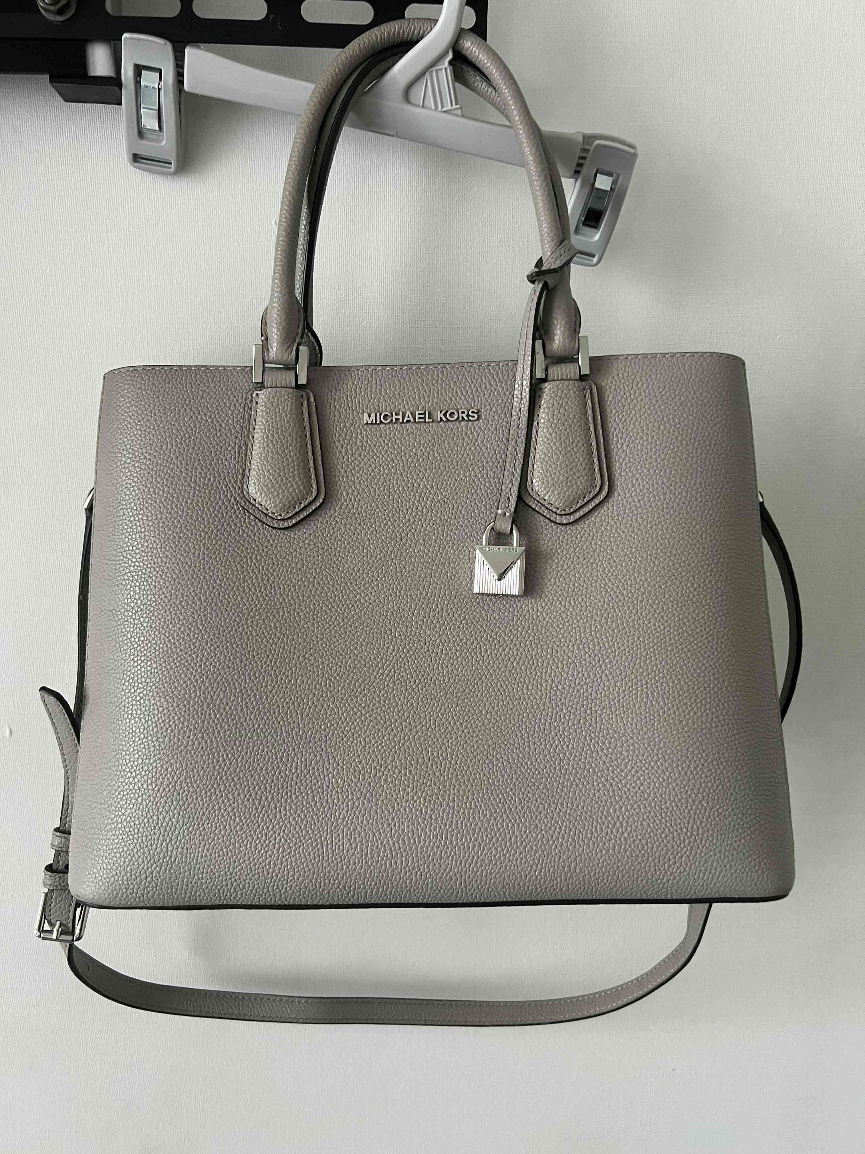 Elegante cartera de cuero gris de Michael Kors. Ideal para uso diario o eventos formales. En excelente estado.