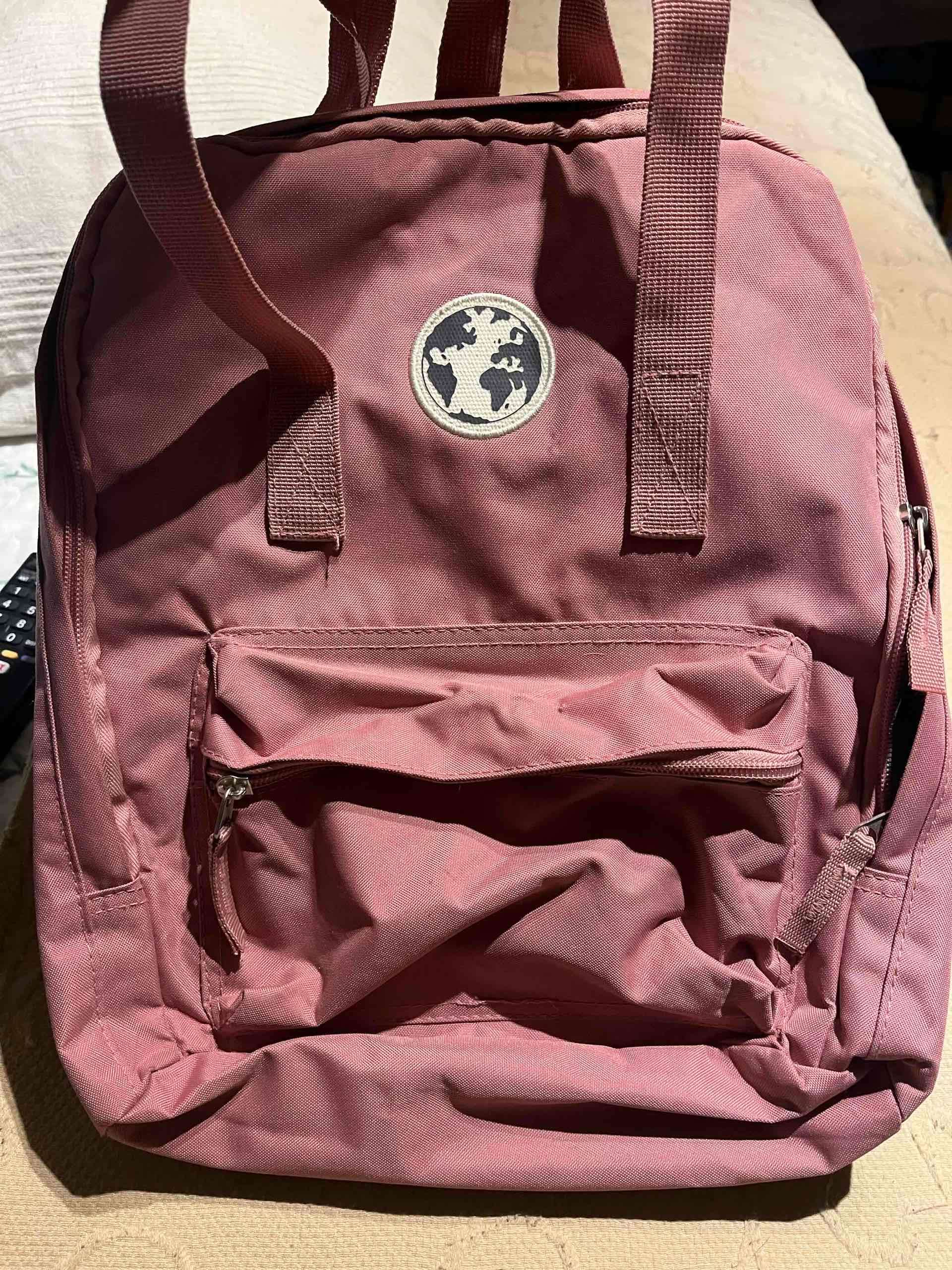 Mochila rosada ideal para uso diario. En buen estado con logotipo decorativo al frente.